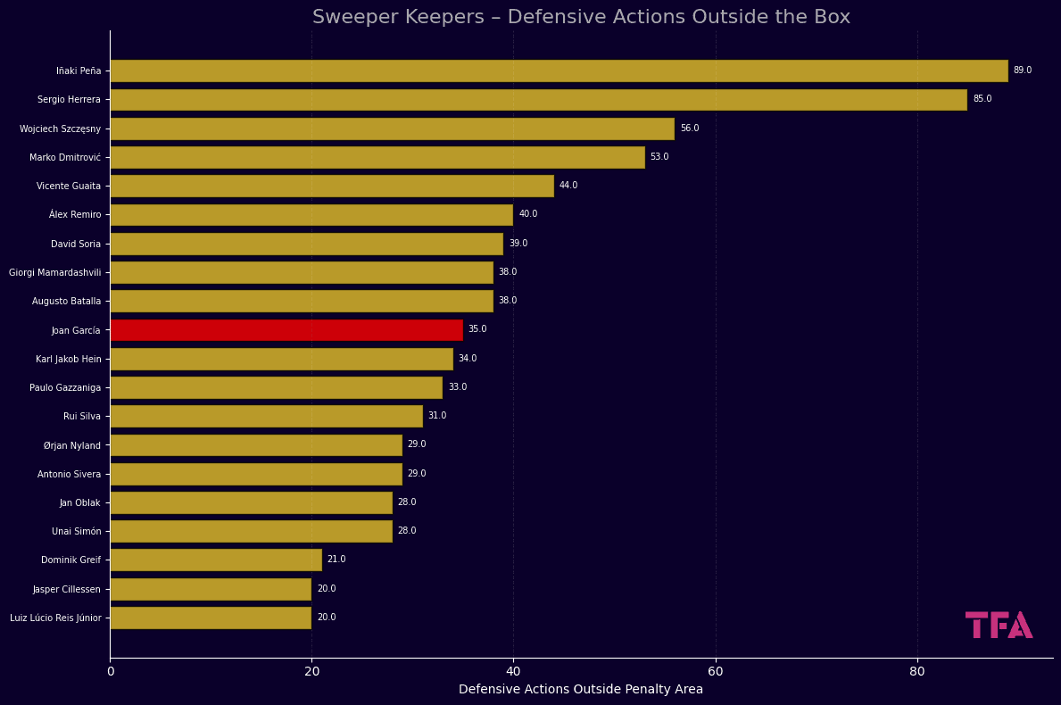 Joan García completed 35 defensive actions outside his penalty area, with an average distance of 12 metres from goal, placing him among the more assertive sweeper-keepers in the league.
