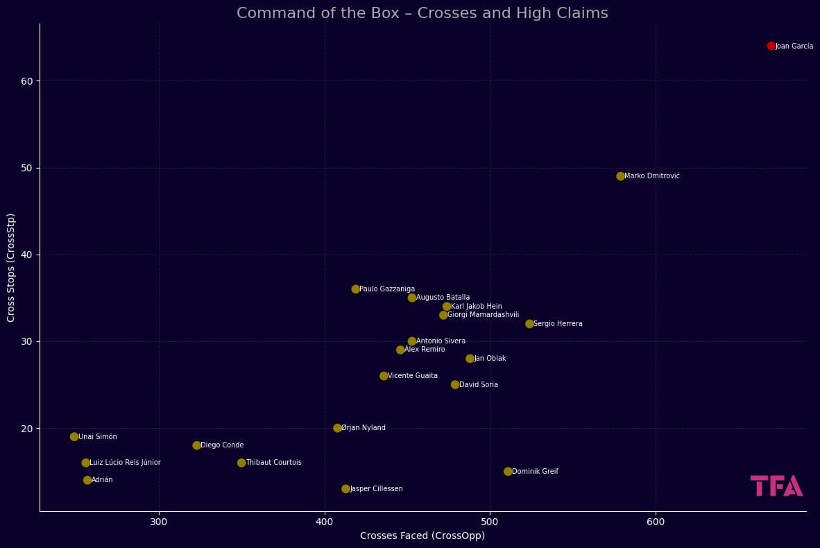 Joan García was one of LaLiga’s most active keepers in this aspect, facing 670 cross attempts into his area and successfully stopping 64 of them.