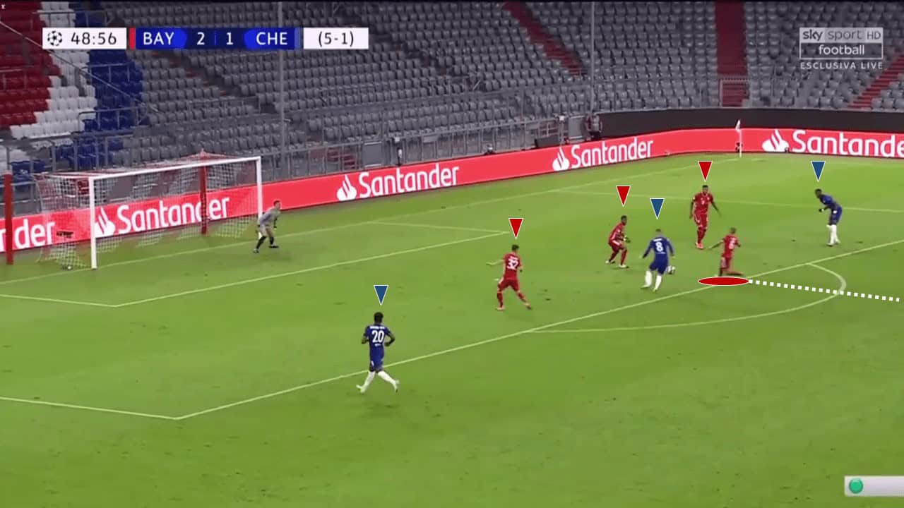 In the Champions League fixture against Chelsea, we had seen Bayern play a very high line, meaning that they could be vulnerable on the break. Above is an example where the Blues have effectively created a three on three situation with the Bayern defenders running back to get players behind the ball. Chelsea’s winger makes a wide run and with one more pass, could find himself through on goal.