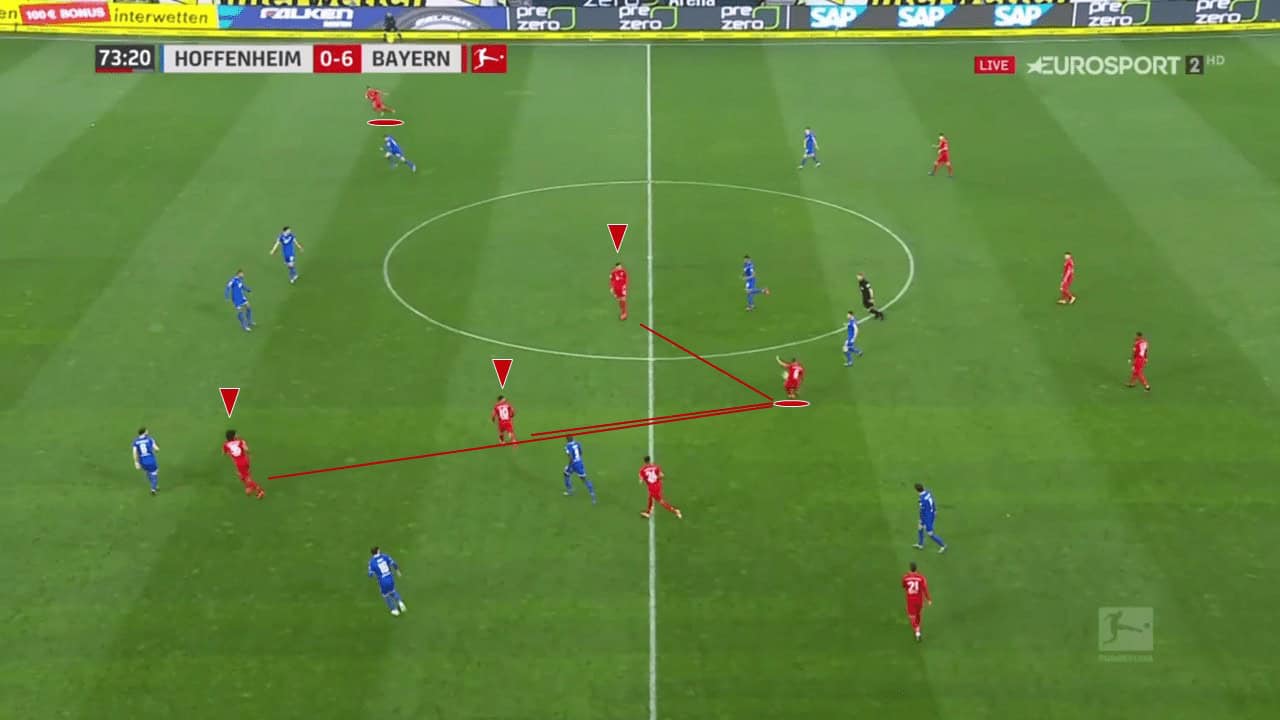 This is largely made possible by Thiago’s passing ability, with the Spaniard’s balls bypassing the midfield and moving straight to the final third. This immediately puts pressure on the opposition defence as the midfielders are left scrambling back in order to prevent Bayern from overloading the penalty area. His accuracy and vision make this kind of tactic very dangerous as it provides a reliable mode of attack for his side.