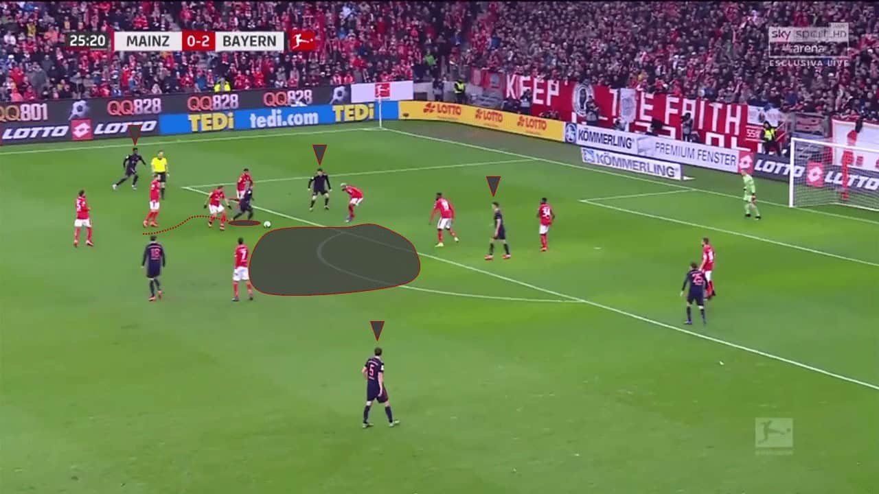 While we have seen his impressive ability in a deep-lying position, Thiago is also capable of progressing the ball up the field on his own. In the above image, we see that the 29-year-old has weaved his way past four Mainz players and hence created space for his other teammates to receive the ball. He has also opened up a pocket of space for him to cut into and find a shot as well, as highlighted in the image. His technical ability to beat players with ease allows him to take the opposition on and the above move ends up with the Spaniard clearing one more defender before firing home. Thiago is able to single-handedly create opportunities for himself and his teammates and such a trait certainly makes him an asset for any side.