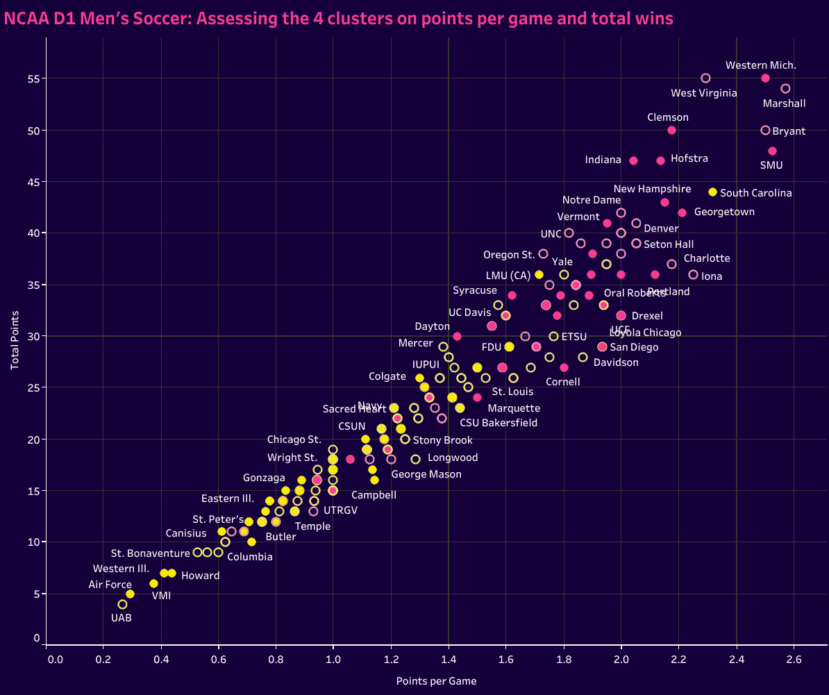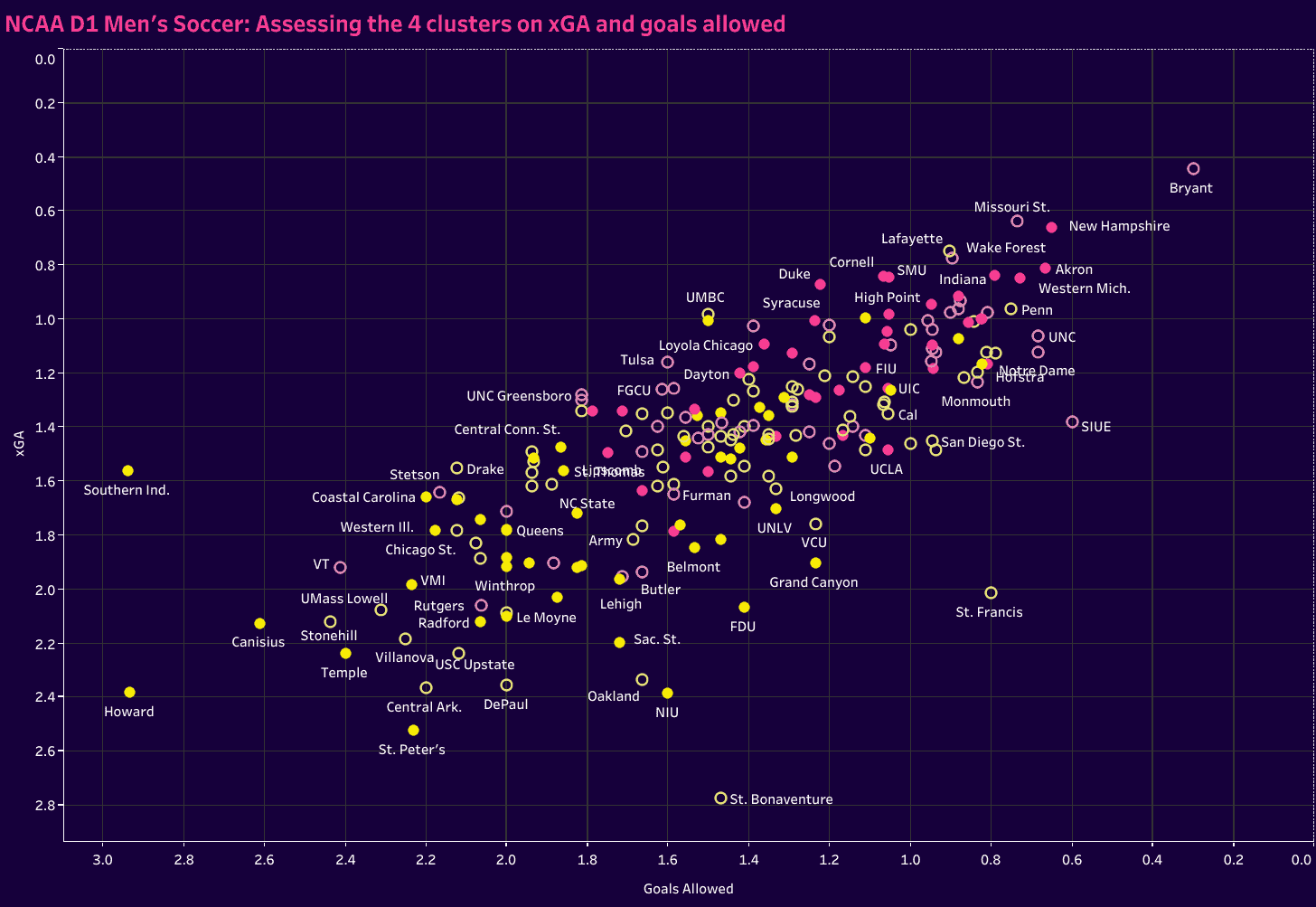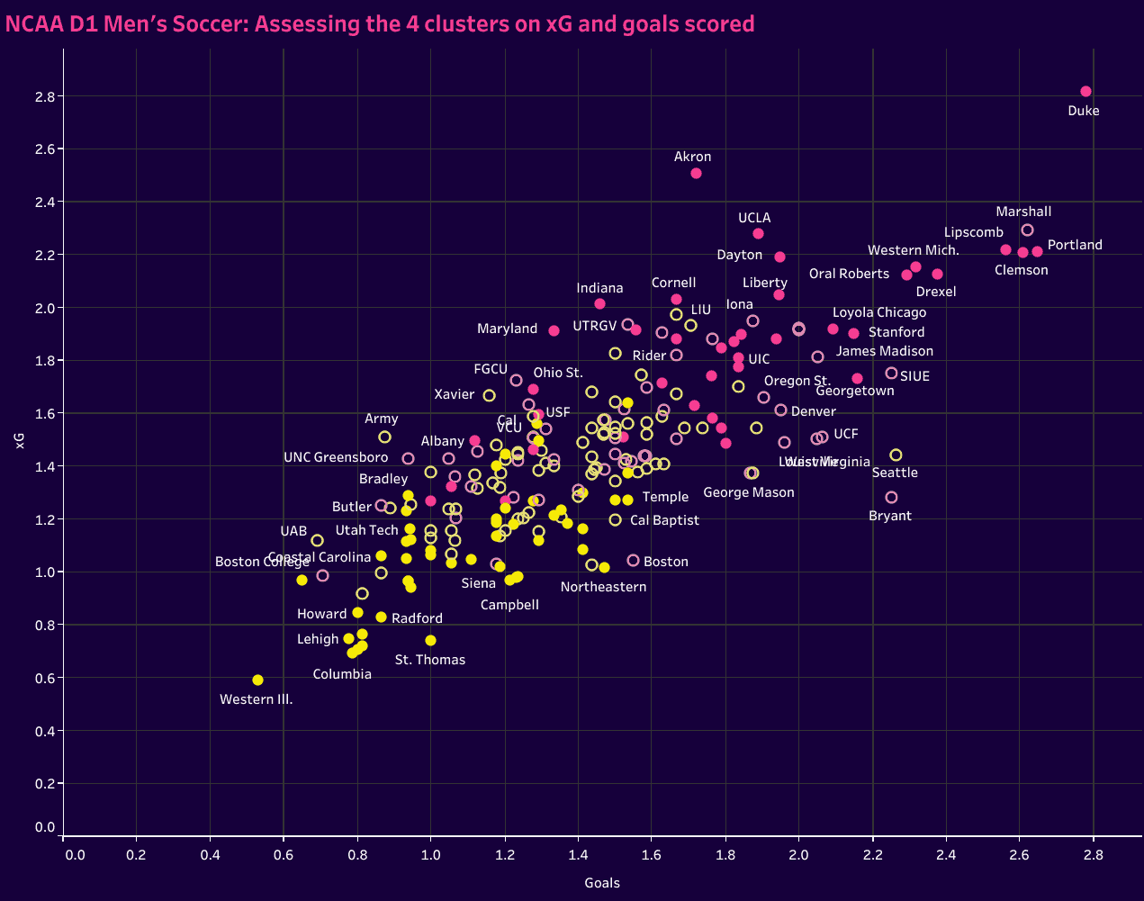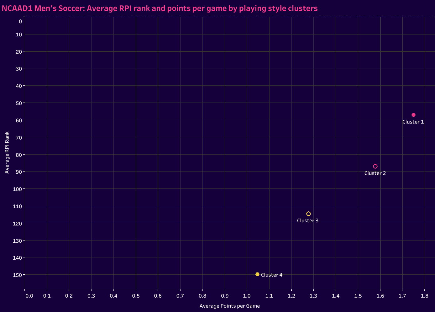 If you haven’t read the NCAA D1 men’s soccer data analysis we published in our February magazine, that’s an important reference point. In that article, we used a clustering technique that weighed event data to break each D1 team into one of four clusters. Those groups represent similarities in playing style. It’s not to say that the game models are exact, but it does point to a high degree of similarity in the way each team approaches the game.