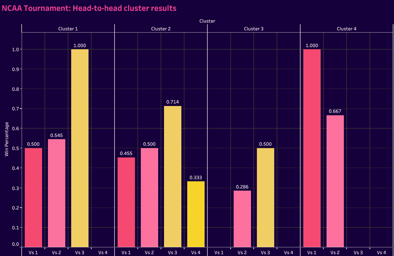 There’s no better place to examine the efficacy of playing styles than with a data analysis of the NCAA tournament. Here, we can see a representation of each of the clusters at the tournament, as well as their success rates. The added benefit is the opportunity for an analysis of the interactions between clusters. In other words, when one cluster plays another, which is more likely to succeed?