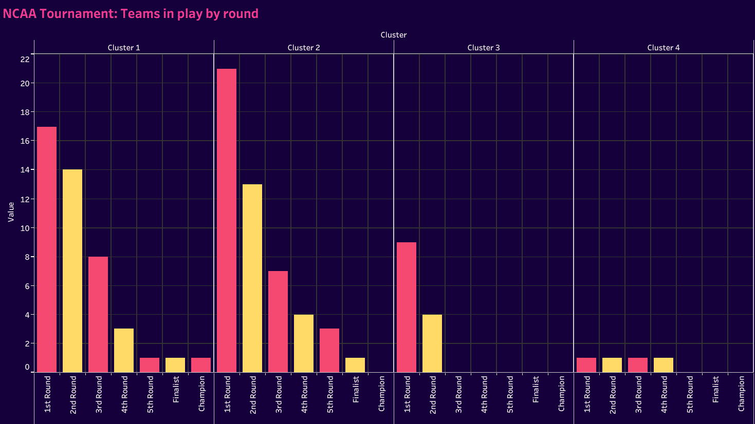 We can also see the difference between the top four conferences and the NCAA as a whole. Very few teams fit into Clusters 3 and 4. Cluster 3 is still decently represented with nine teams, but we can see the numbers trailing off. Once we get to Cluster 4, only three teams from the top four conferences fit our statistics-derived groupings.