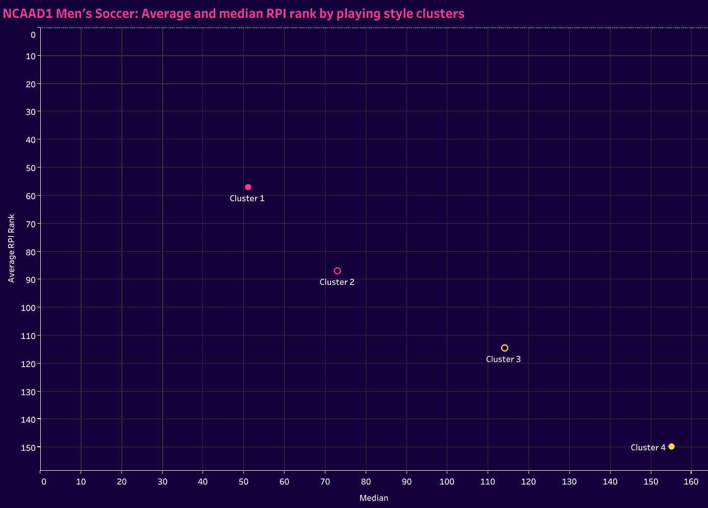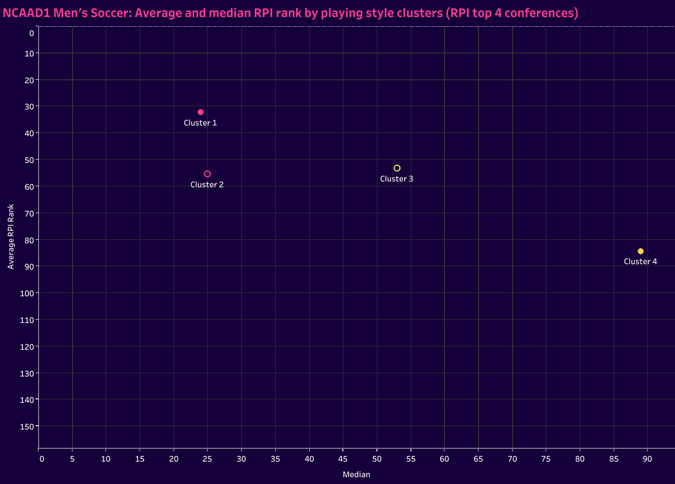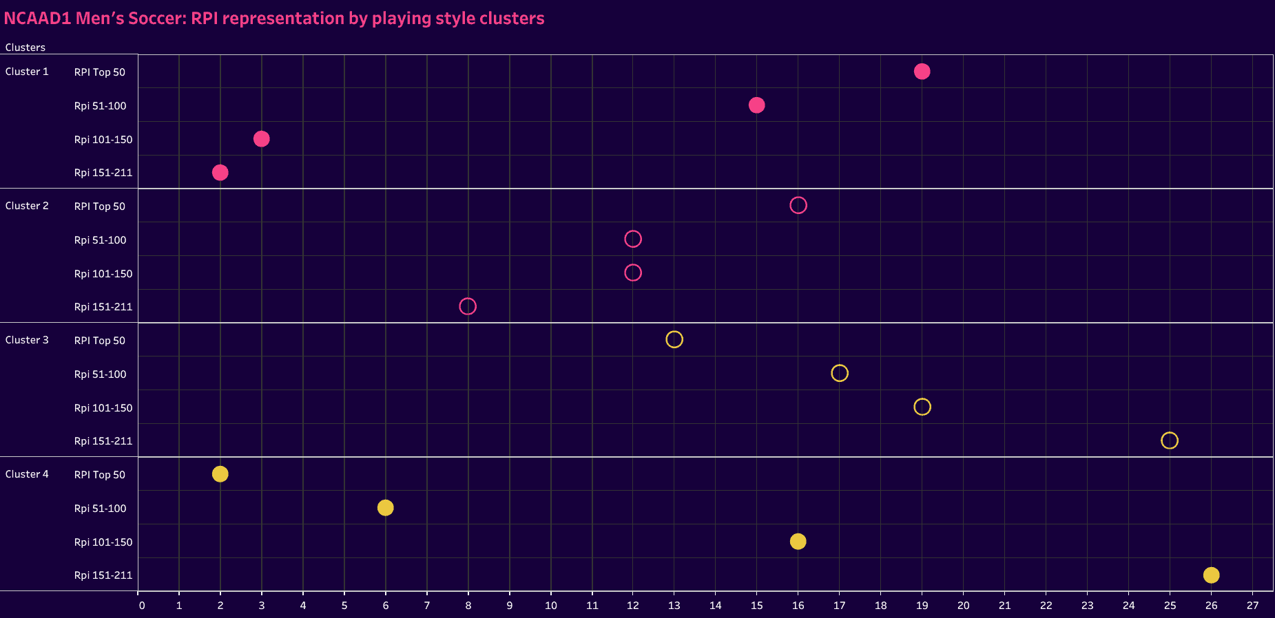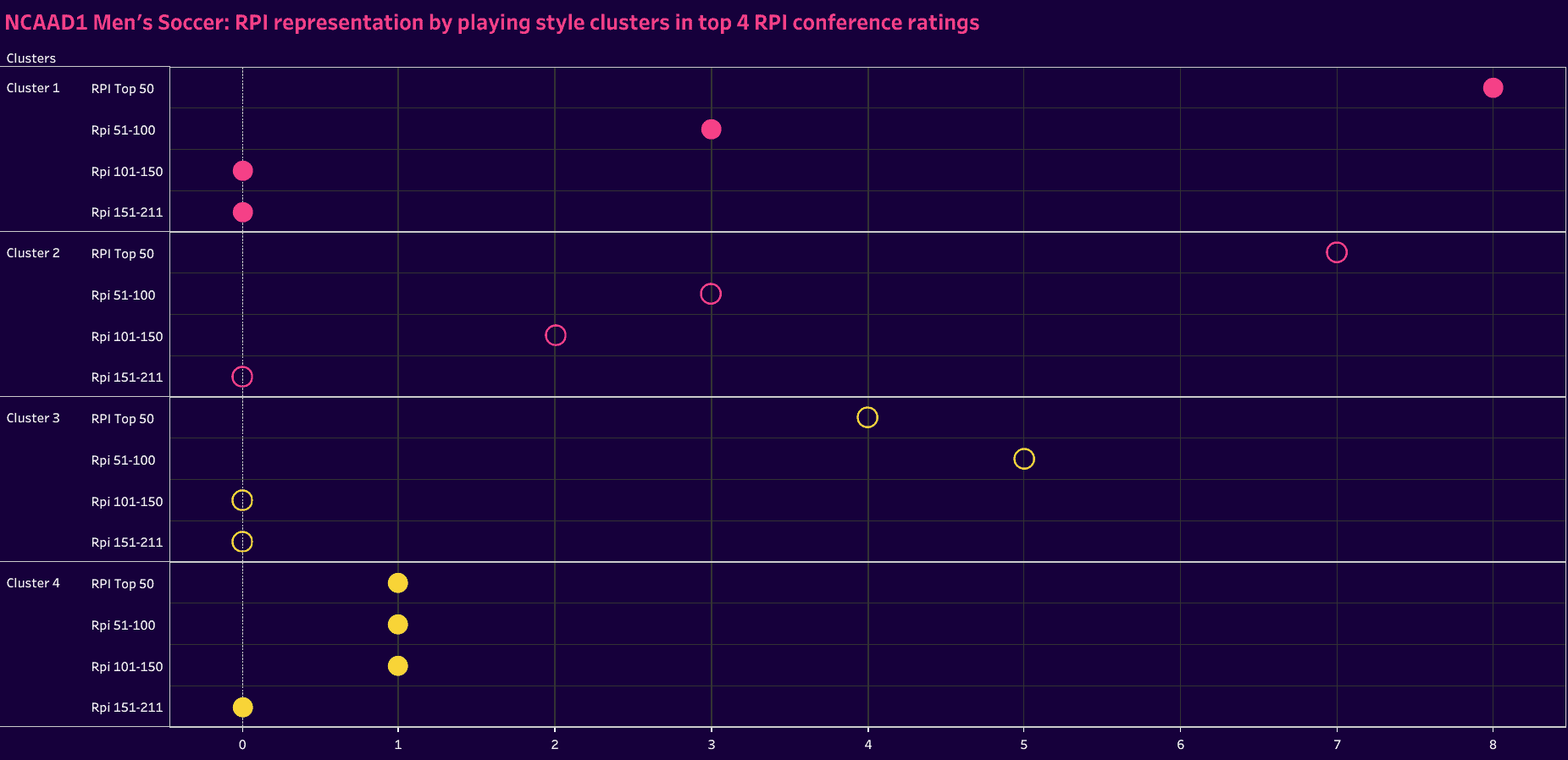 Let’s start with a listing of each cluster to give a sense of representation across NCAA D1 men’s soccer. The first cluster, our more possession-dominant and high-pressing teams, are the least representative. They’re followed by the second and fourth clusters. That third group is the most common style of play, relying on defensive security and attacking transitions to execute their game model.