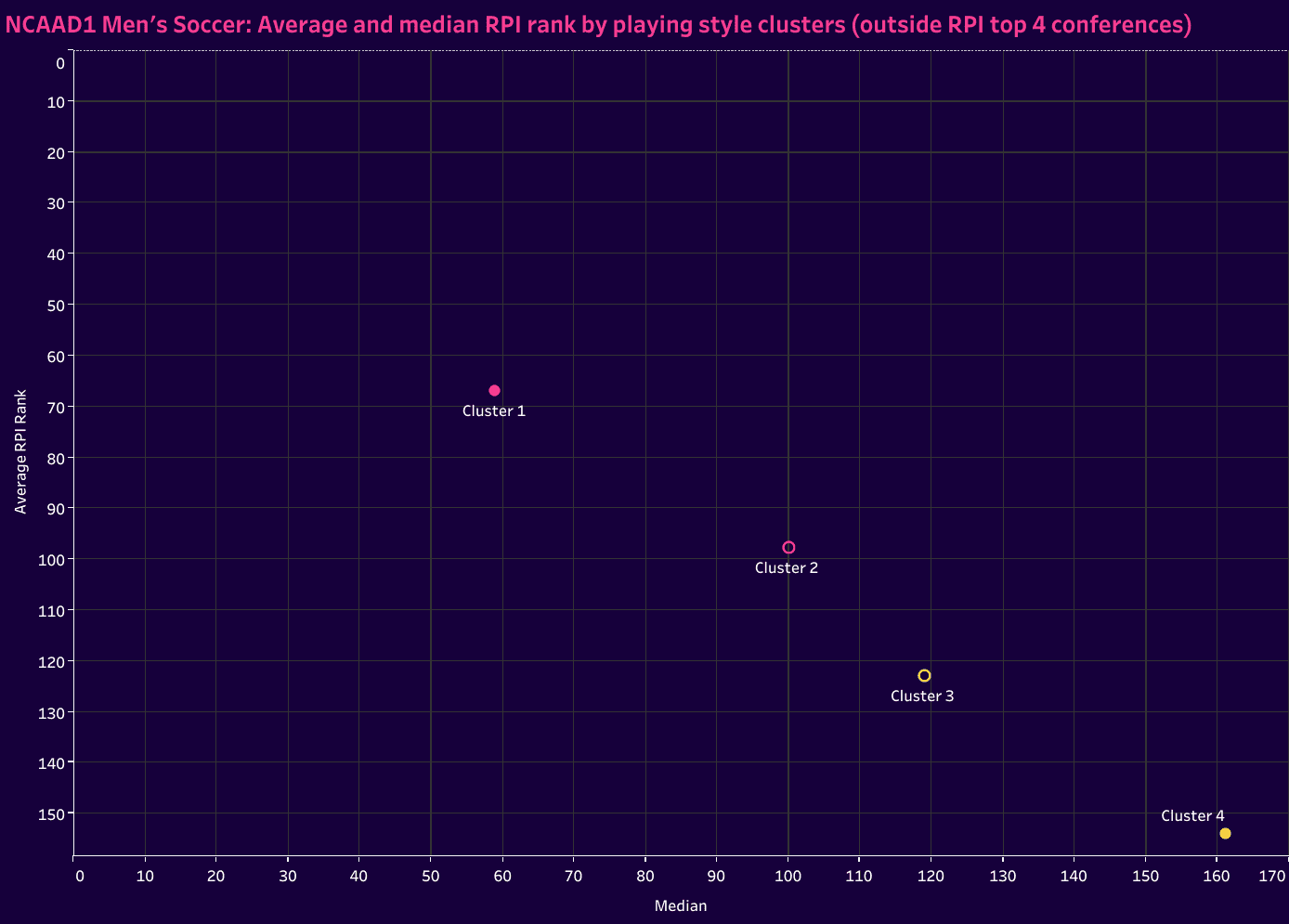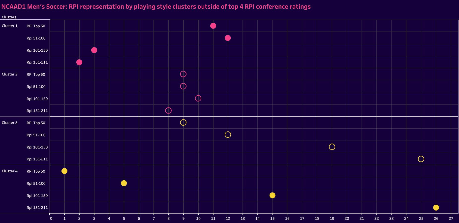 For middle-tier teams within each conference, Clusters 2 and 3 typically offer the greatest return. They may get you into the tournament, but there’s a clear indication that Cluster 3 does come with limited success once teams get to the final rounds of knockout play.