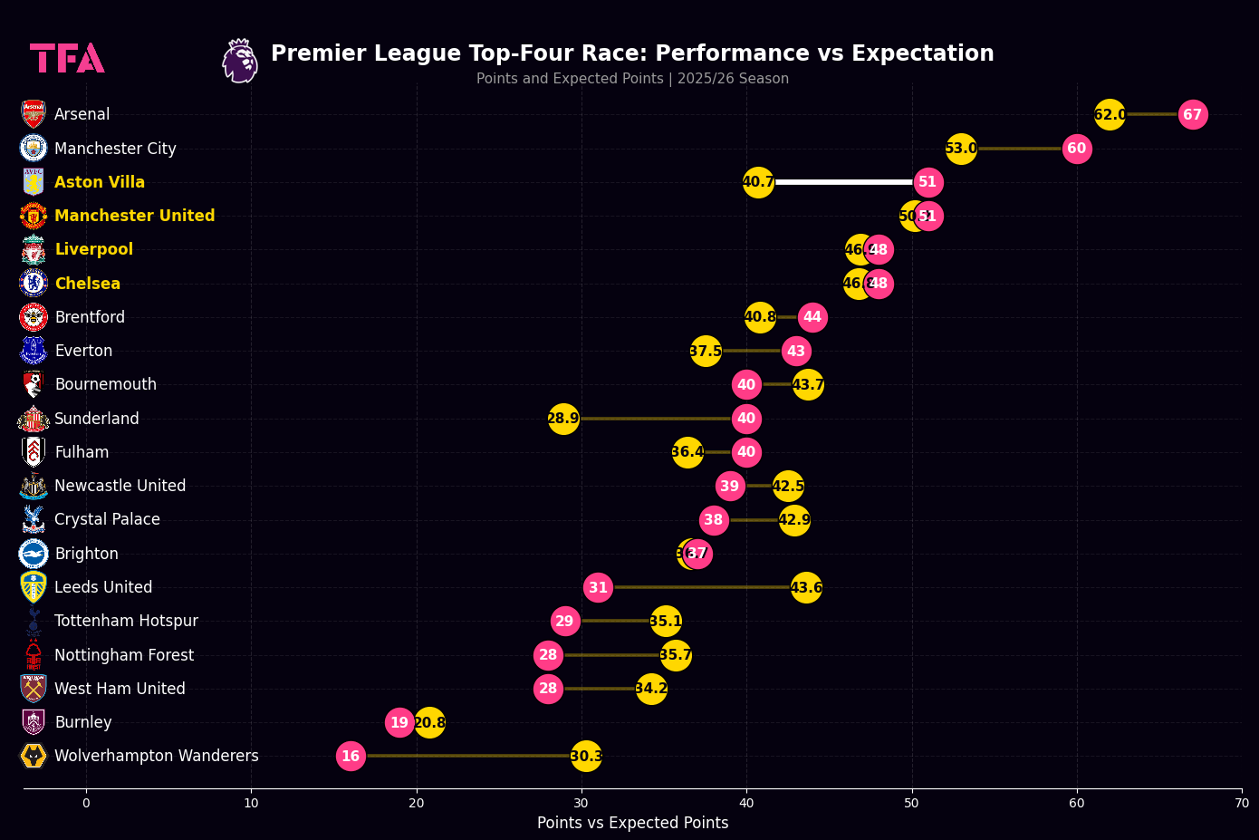 Premier League 2025/2026 UCL Race – Performance Vs Expectation – Points & Expected Points