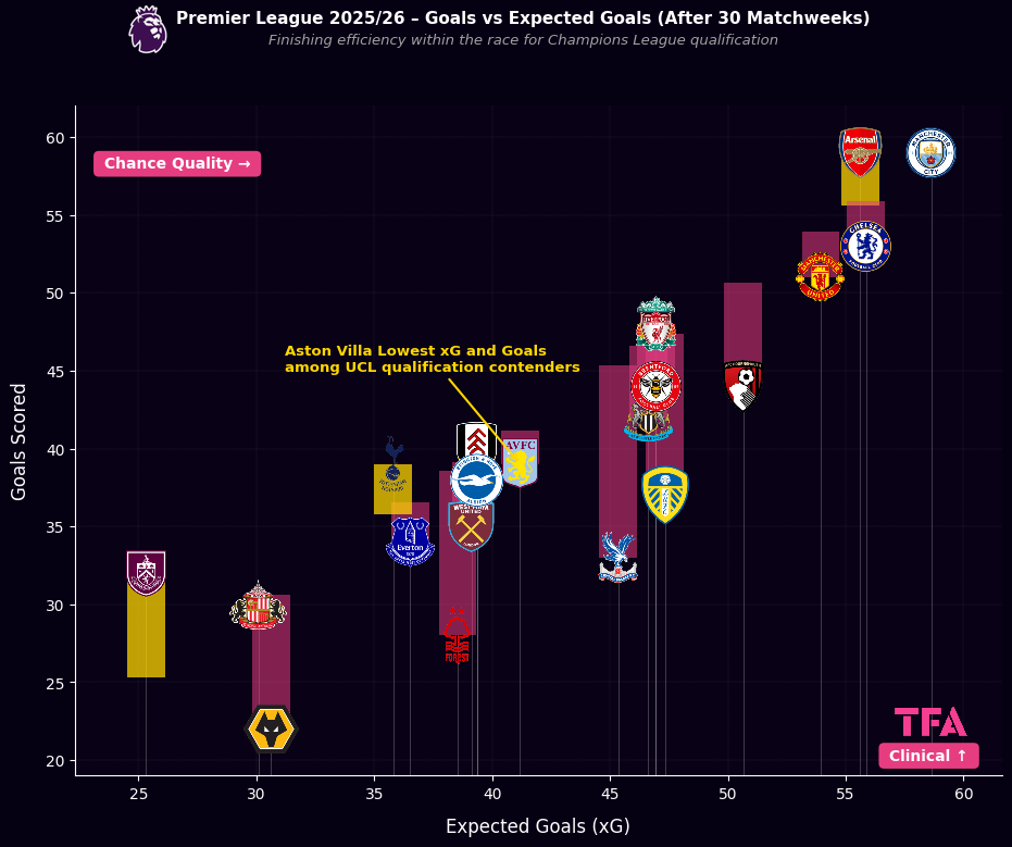 Premier League 2025/2026 Goals Vs Expected Goals – Aston Villa Lowest xG & Goals Among UCL Qualification Contenders