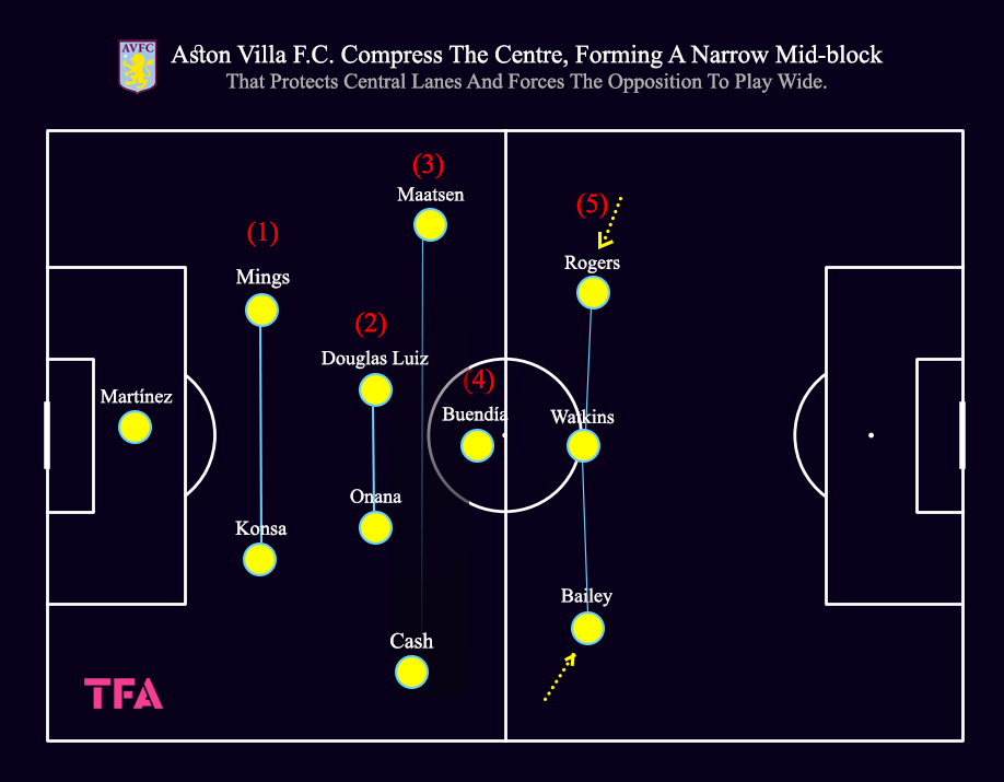 Aston Villa Compress The Centre, Forming A Narrow Mid-Block That Protects Central Lanes & Forces The Opposition To Play Wide