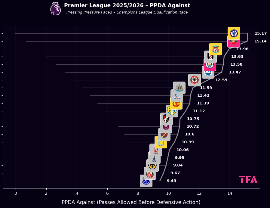 In the 2025/2026 Premier League, Chelsea registered the highest PPDA against at 15.17, meaning opponents attempt fewer defensive interventions against them than against any other team.