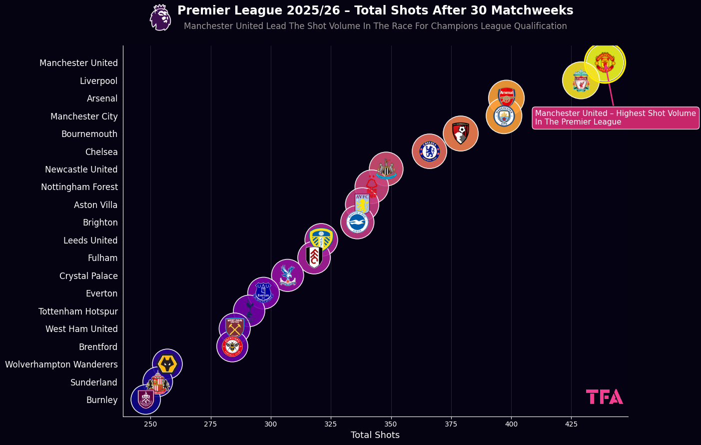 Premier League 2025/2026 – Manchester United Lead The Shot Volume In The Race For Champions League Qualification