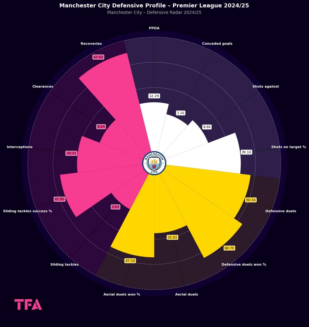 City’s low defensive activity across almost every metric may hint at a system so committed to possession that it leaves little margin for defensive error.