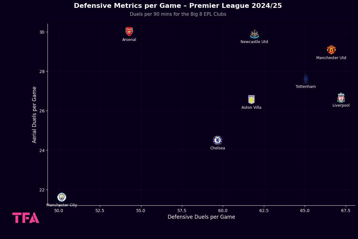 In contrast, Manchester City were clear outliers in this category, registering the fewest defensive duels (50.16) and the lowest aerial duel involvement (21.61).
