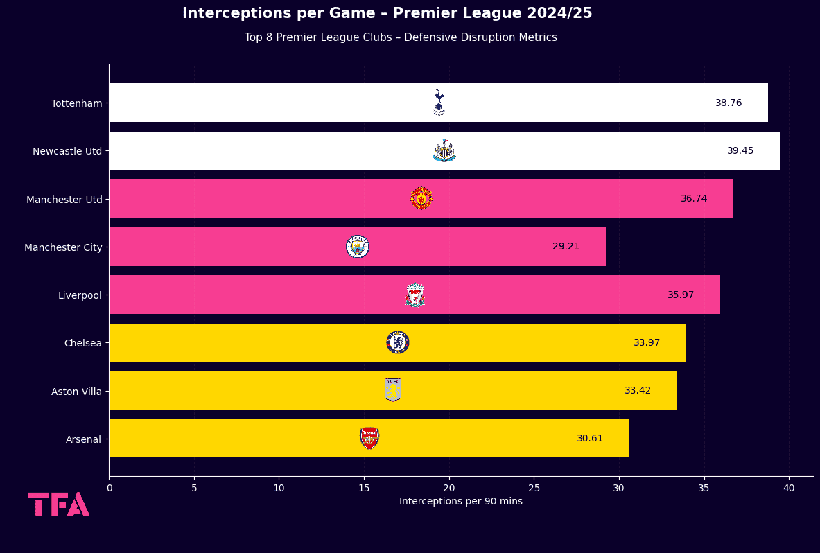 Newcastle United sit at the summit with 39.45 per 90 minutes, a figure that reflects their sharp defensive anticipation and cohesive off-the-ball structure.
