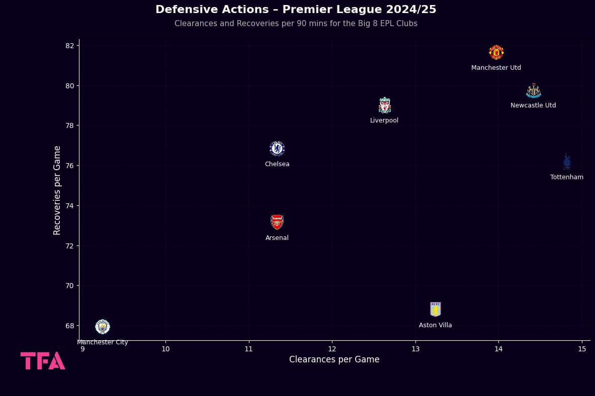 Manchester City stand apart with the fewest clearances (9.24) and recoveries (67.92) among the group, figures that, at first glance, reflect their exceptional control over territory and possession.