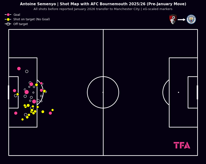 Antoine Semenyo Shot Map With AFC Bournemouth 2025/2026 (Pre-January Move)