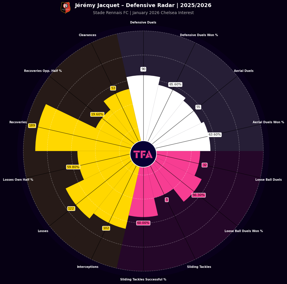 Jérémy Jacquet Defensive Radar At Stade Rennais FC 2025/2026