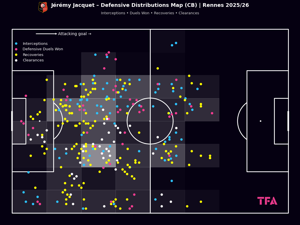 Jérémy Jacquet Defensive Distributions Map (CB) At Rennes 2025/2026