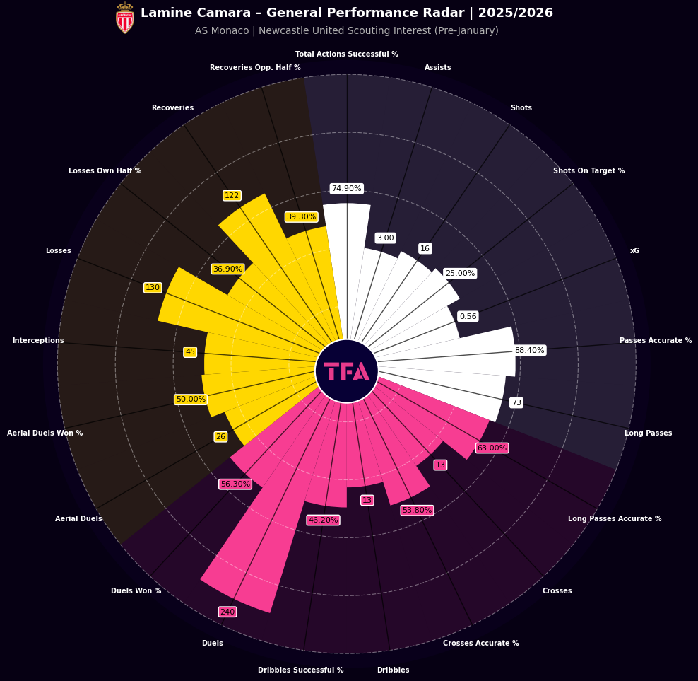Lamine Camara Performance Radar With AS Monaco 2025/2026