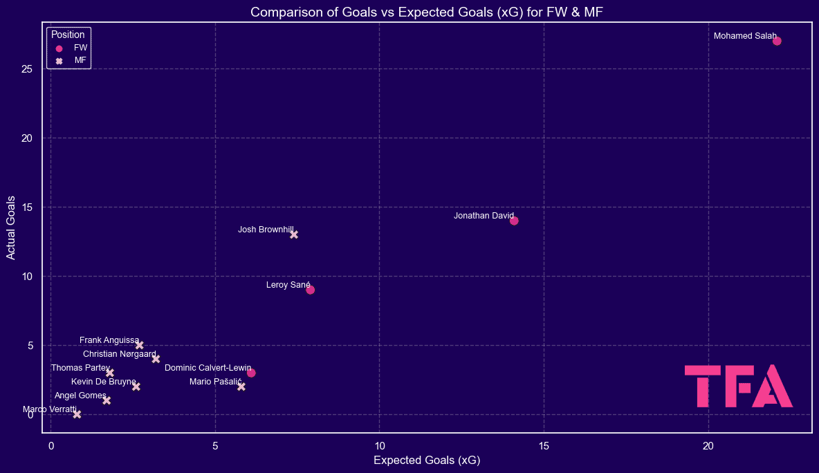 One of the most insightful ways to evaluate attacking efficiency is by comparing a player’s actual goals to their expected goals (xG).