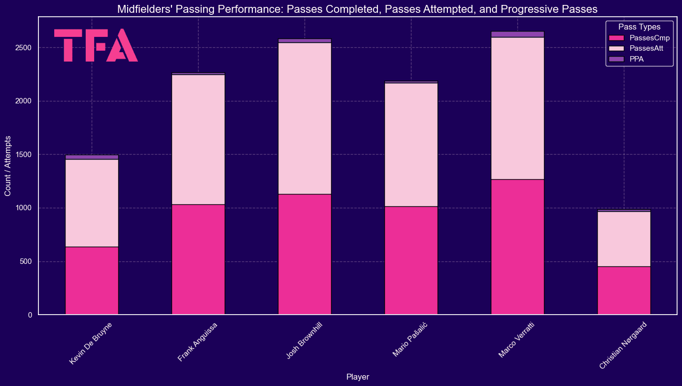 In this section, we analyse the passing metrics of the free-agent midfielders in the 2025 dataset—focusing on three main statistics: Passes Completed, Passes Attempted, and Progressive Passes.