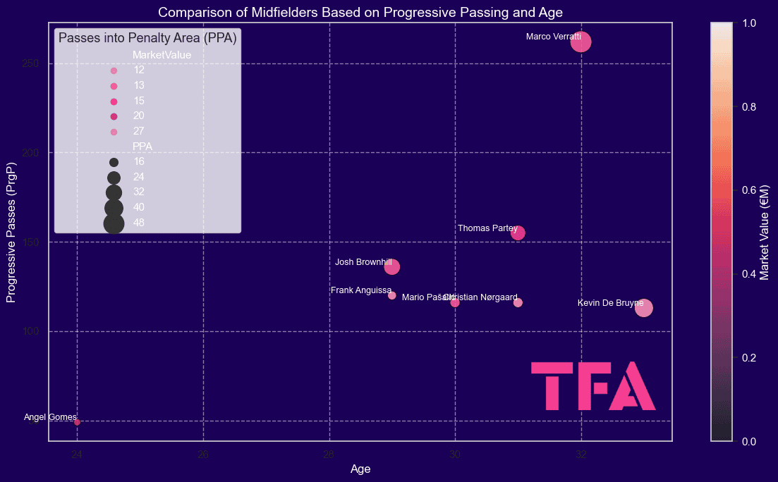 Let’s examine the relationship between age, progressive passing, and market value for the midfielders among the 2025 free agents in more detail.