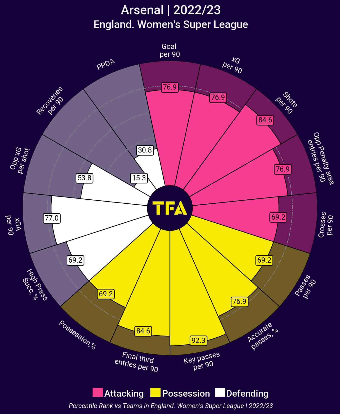 If we look at the pizza chart above, we can see that Jonas Eidevall’s side rank highly in terms of key passes per 90. This means that Arsenal are very productive with their passing and frequently play passes that immediately generate goal-scoring opportunities. Arsenal averages 58.59% possession per 90, indicating a desire to play a possession-based style, in keeping with the ‘Arsenal DNA’ that runs throughout the club.