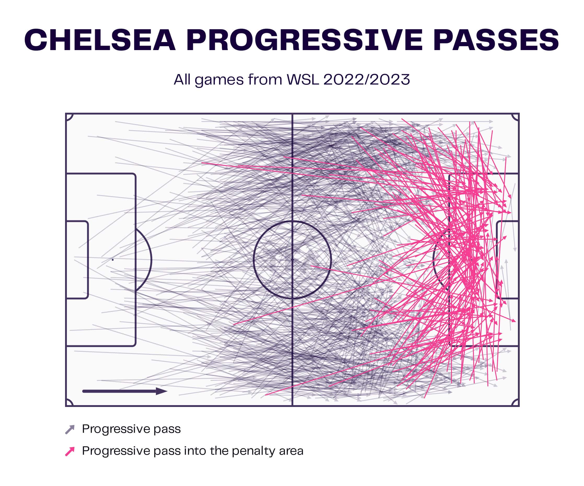 Chelsea not scared of launching the ball long if necessary as they average 49.8 long passes per 90 – this provides them with the opportunity to rapidly transition from defence to attack and play Sam Kerr in behind the opposition defensive line.