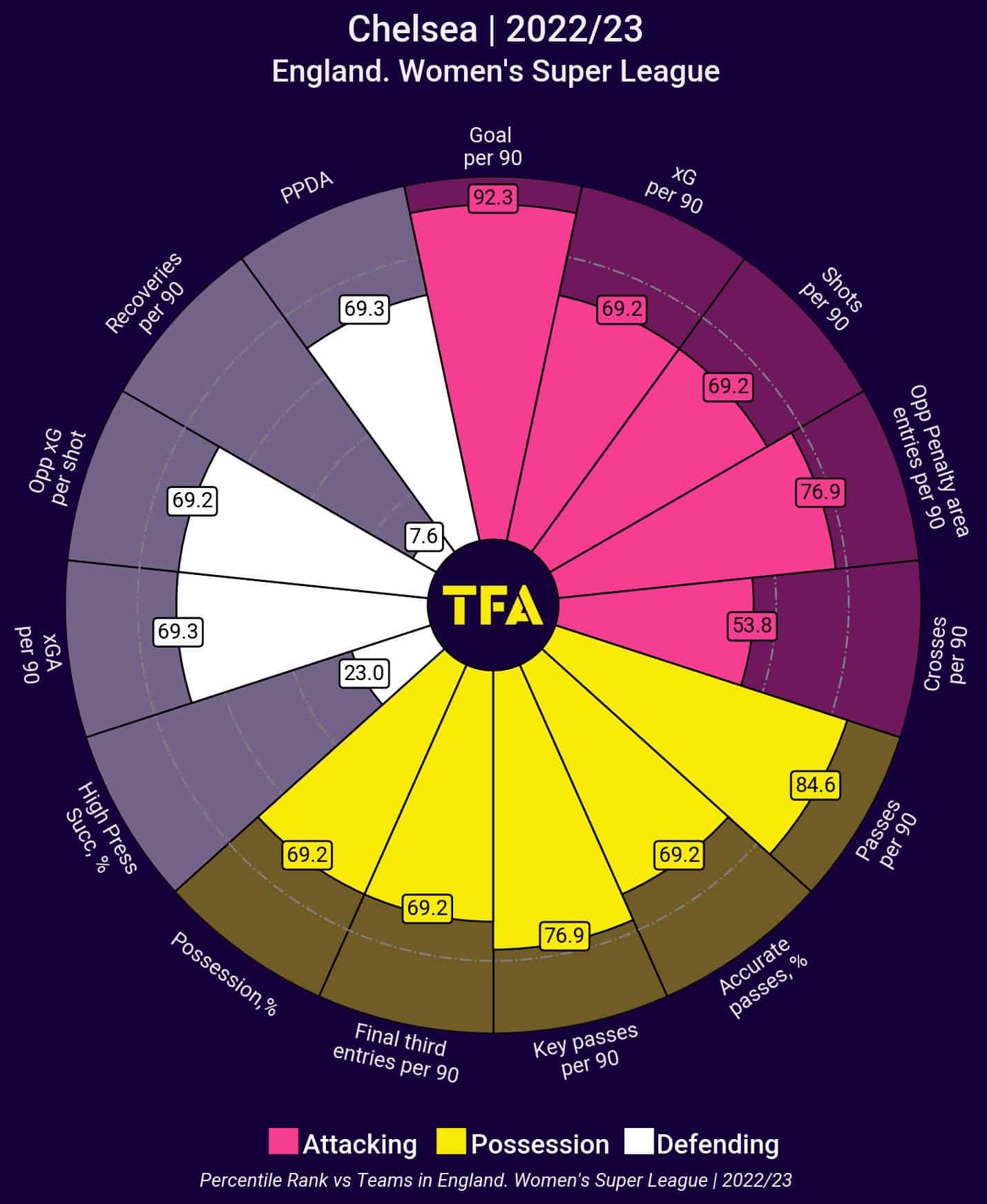 Let’s now turn our attention towards the defending champions, Chelsea. If we look at the pizza chart showing The Blues’ percentile rankings, we can see it differs vastly from that of Manchester United. Emma Hayes does ask her team to frequently press high but they understand that this is unsustainable throughout 90 minutes and are flexible with their press.