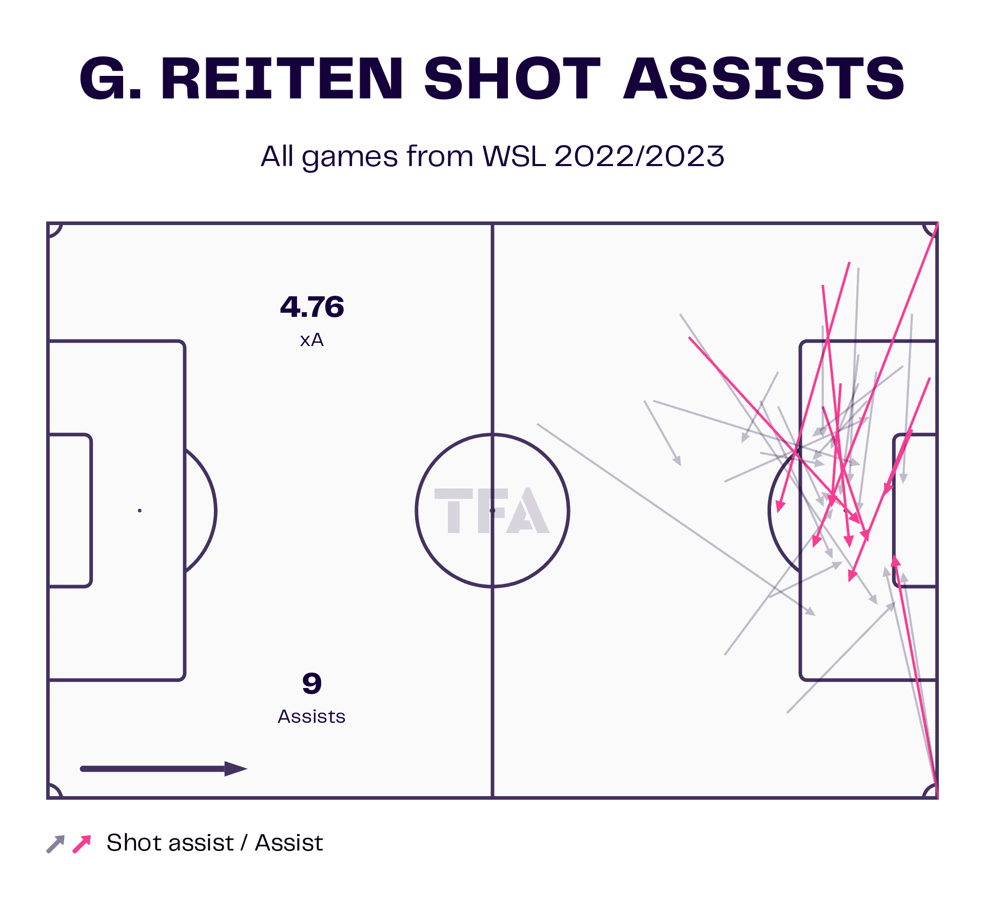 One player that has been absolutely integral to Chelsea this season is Guro Reiten. The Norwegian international leads the WSL assist charts with nine, meaning she averages 0.73 assists per 90. As we can see from the data visual above, Reiten’s nine assists have occurred from 4.76 expected assists. This number is of course influenced by the fact that Reiten does take set pieces for Chelsea. We can also see that the majority of her shot assists stem from the left wing, indicating that Chelsea like to maintain the width of the pitch to ensure there are plenty of opportunities to progress the ball into the box.