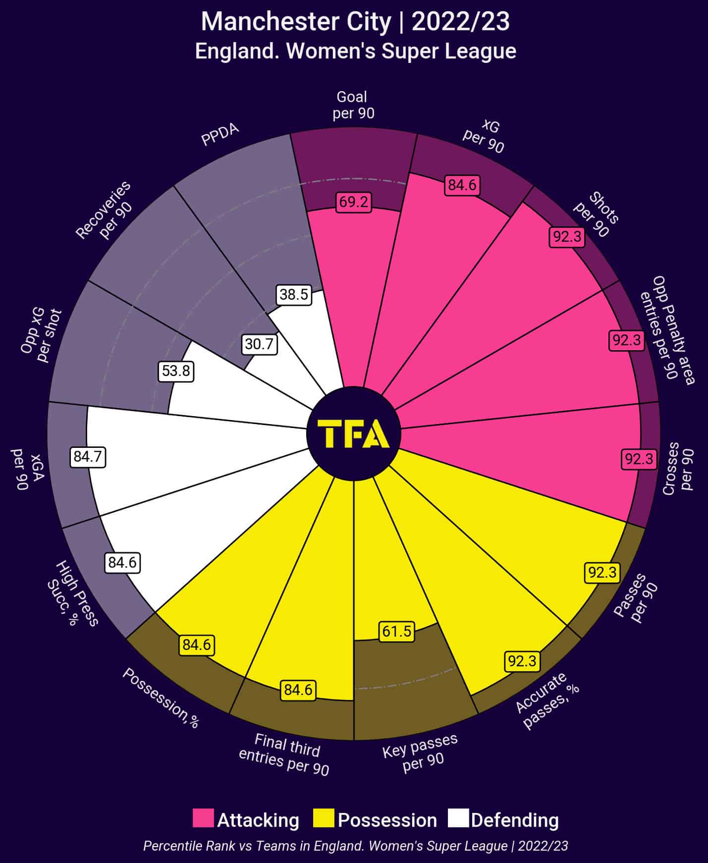 The fourth and final team in this WSL title race is Manchester City. Despite losing key players over the summer as Lucy Bronze, Georgia Stanway and Keira Walsh all departed the club, Gareth Taylor’s team have recovered remarkably well. As we can see from the pizza chart, similarly to Manchester United and Arsenal, Taylor likes his team to play possession football as they average 60.83% of the ball per 90.