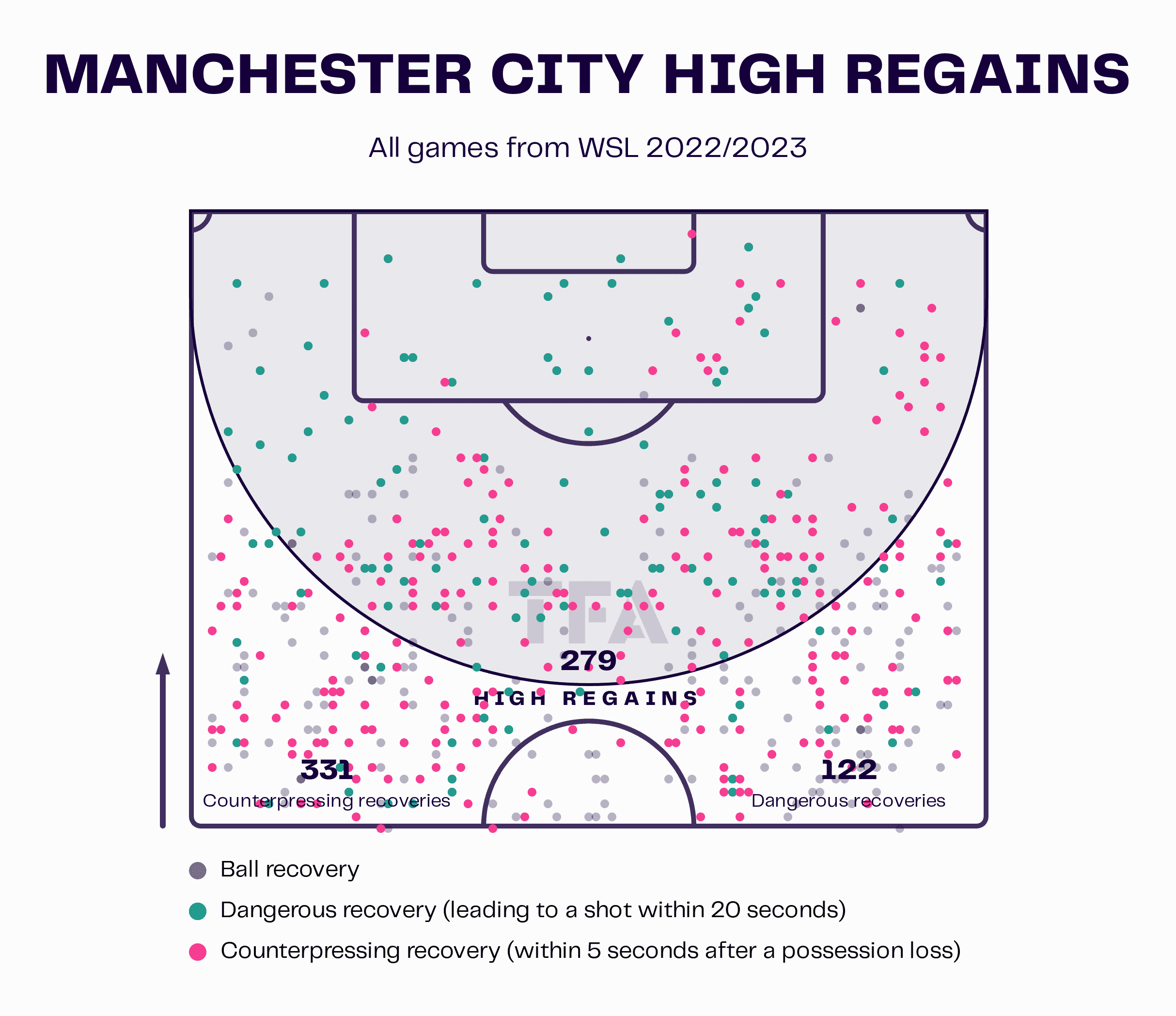 Whilst we have established that all the teams in this title race look to press high in order to regain possession quickly, it is Manchester City that are statistically the most effective at this. The team carry out Gareth Taylor’s desired pressing style extremely effectively. They win the ball back further up the pitch than any other WSL team with 279 high regains. This translates into 122 dangerous recoveries, meaning that the recovery of possession has led to a shot within 20 seconds.