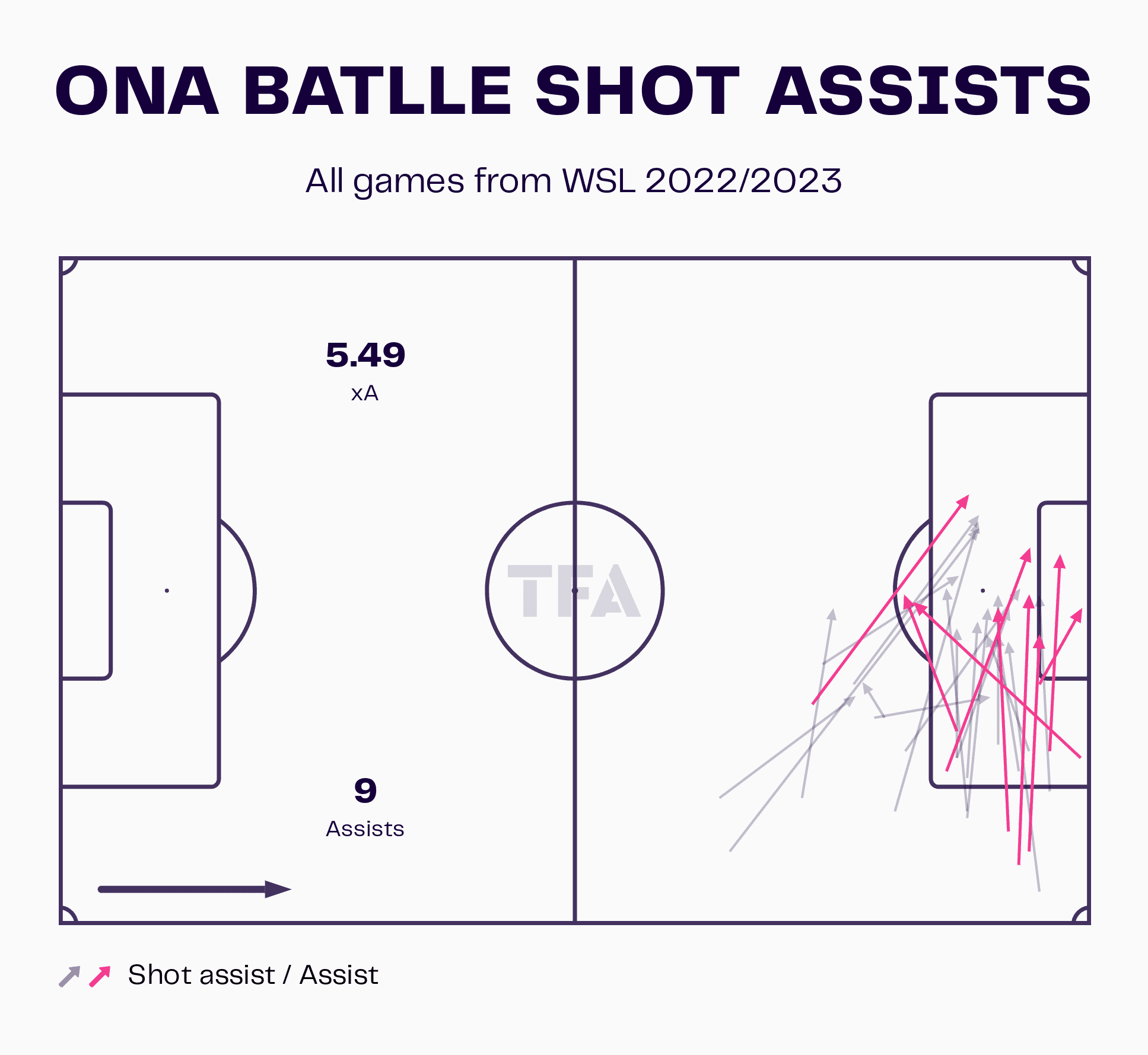 Manchester United have been nothing short of clinical so far this season. They lead the WSL scoring charts averaging 2.71 goals per 90 and having netted 46 times so far from an xG of 38.76, with two of them coming from the penalty spot. Right back Ona Batlle makes absolutely pivotal contributions to the United attack. The Spaniard who looks set to leave Manchester in the summer has set up nine goals for her teammates so far this season. Her impending departure will leave a huge gap in this team that Marc Skinner will need to address if he wants to continue this upward trajectory of the club.