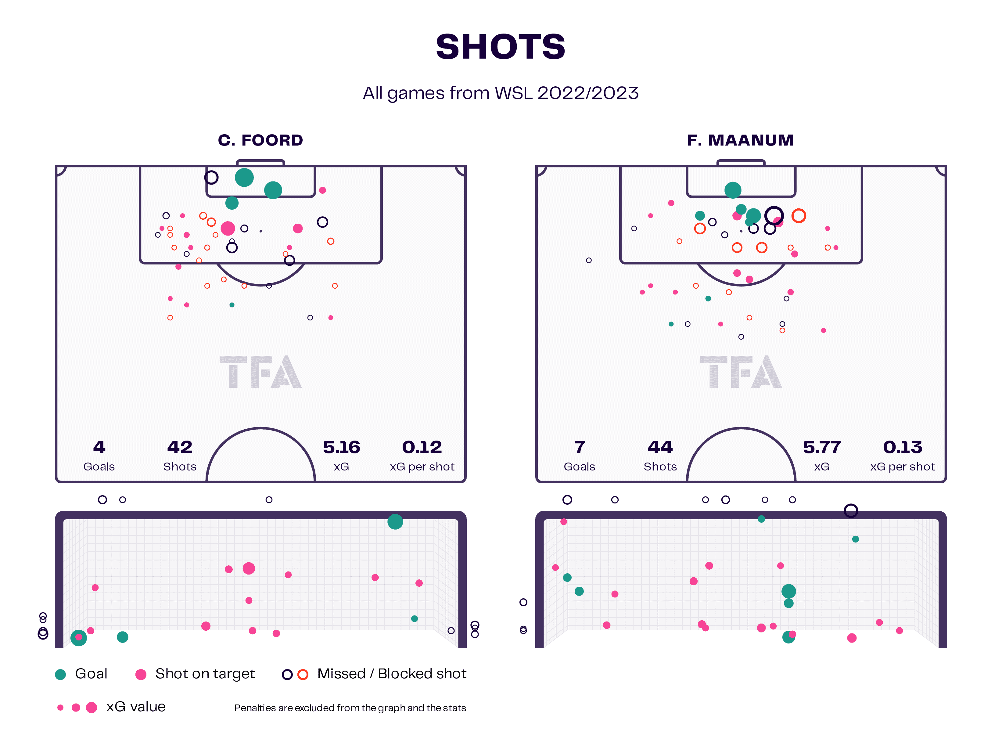 These shot maps show us the goal contributions of the aforementioned Foord and Maanum from the current campaign. Foord has already chipped in with four WSL goals this season which is equal to her tally from the entirety of the 2021/22 season. More impressively, Maanum found the net on three occasions last season. Currently, she has scored seven, this represents a significant increase and shows how she has stepped up when Arsenal needed her the most.