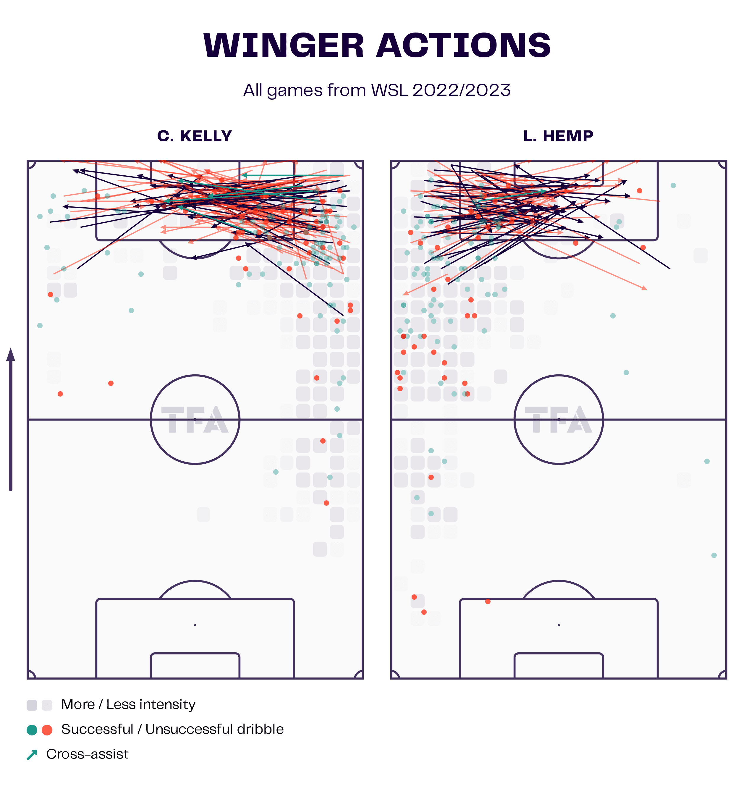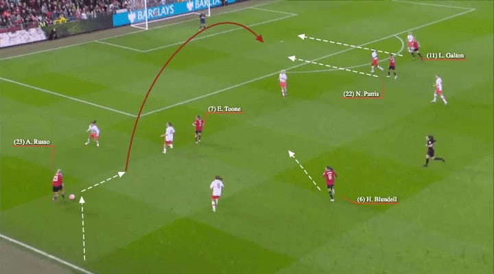 It’s also fair to say that Manchester United have an ideal centre-forward leading their line in the form of Alessia Russo. She does not only provide a goal-scoring threat, her off-the-ball movement means that she creates vast amounts of space for fellow attackers, such as Leah Galton who is having a stellar season herself. Moreover, Russo loves to work the channels, meaning she frequently looks to provide crosses into the box as we can see in figure 1.1.