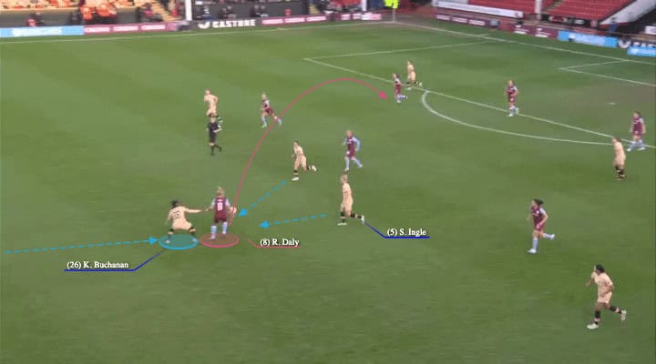 The Chelsea press is incredibly key to their rather relentless attack. As we can see in figure 2.1, The Blues have turned over possession and as Aston Villa look to launch a counterattack, Kadeisha Buchanan moves to immediately counterpress Rachel Daly, leaving her no option to play backwards.