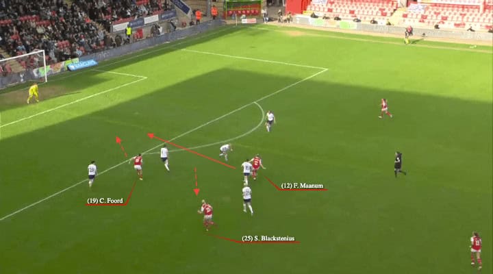 Stina Blackstenius now mostly operates as the number ‘9’ by Jonas Eidevall as he attempts to plug the gap left by the loss of Miedema. However, the Swede is a slightly different profile of player to the prolific goal scorer Miedema. As shown in figure 3.1, Blackstenius is more likely to drop deeper in order to retain or regain possession for Arsenal. Subsequently, this means that the likes of Foord (left winger) and Maanum (attacking midfielder) make more penetrating runs into the penalty area and thus contribute to more goals.