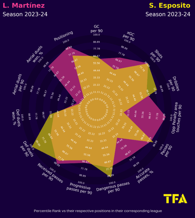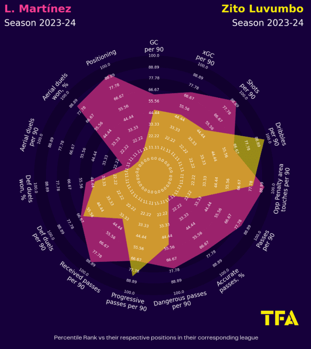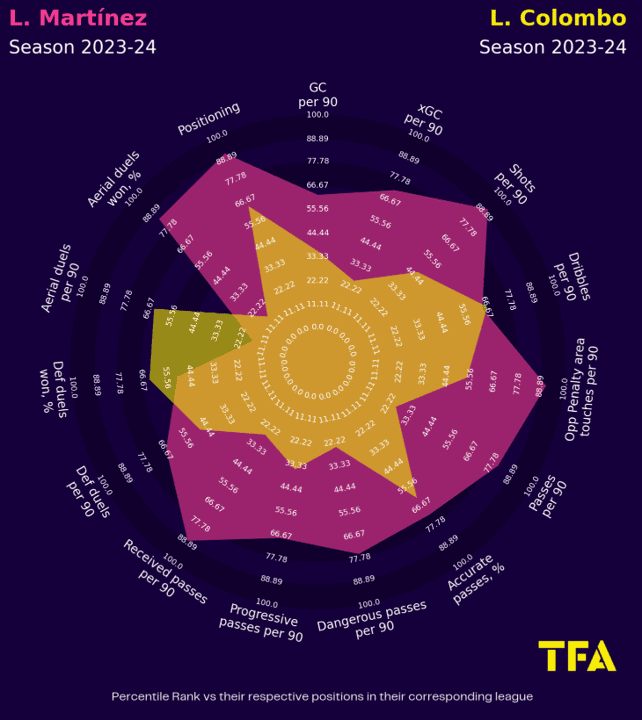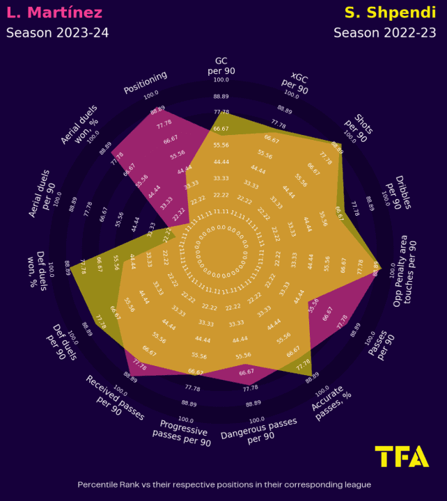 While the 22-year-old is still yet to reach the goalscoring numbers of Martínez, he has shown promise and statistical similarities, posting similar percentiles in dangerous passes, dribbles, positioning, and shots per 90 (in the 22/23 season)