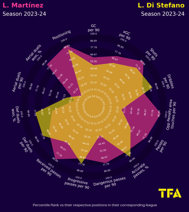 Di Stefano struggled in front of goal last season, bagging three G/A in 884 minutes – this runs as a relatively close percentile to Lautaro Martínez, but again, league differences must be accounted for.