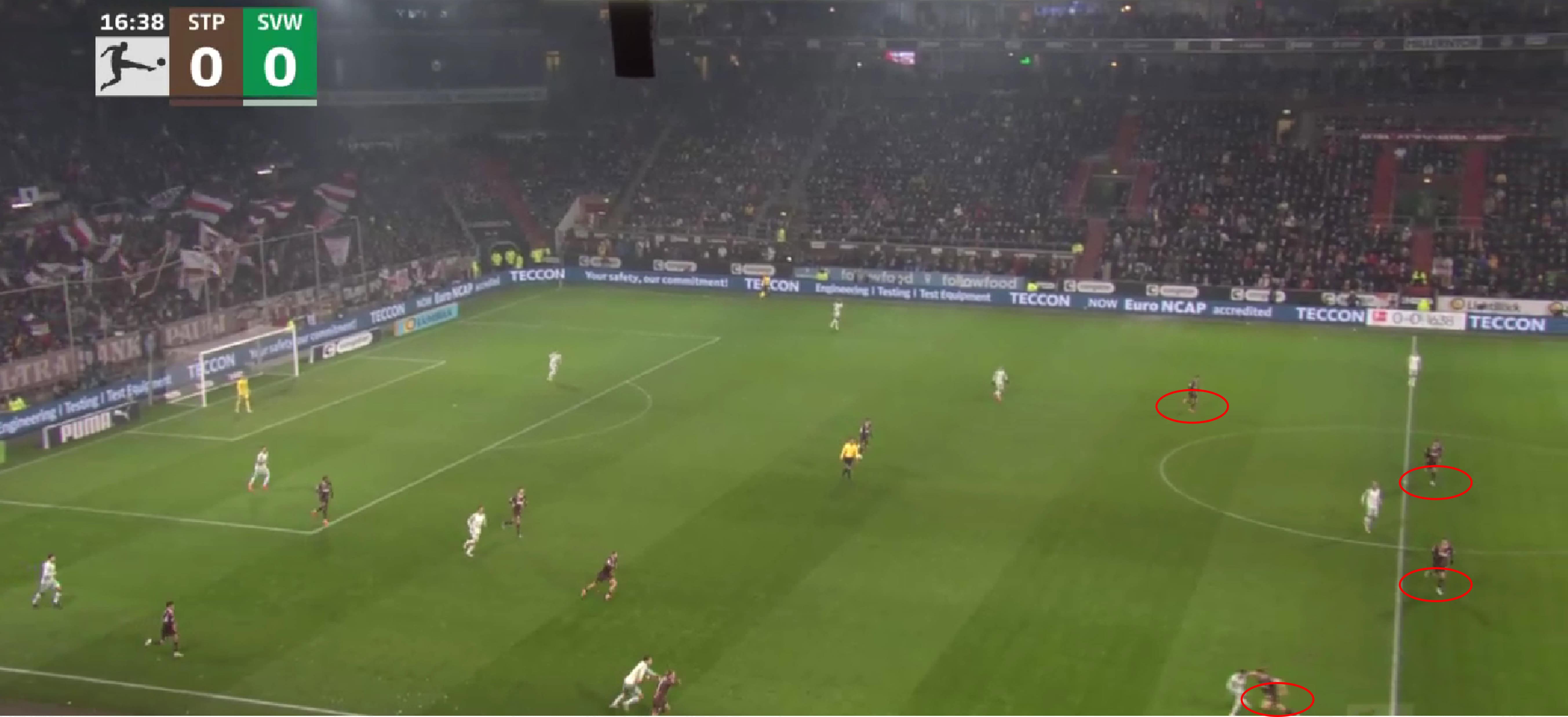Werder now open the play with a pass to one of their centre-backs, simultaneously triggering St. Pauli’s attacking press.
