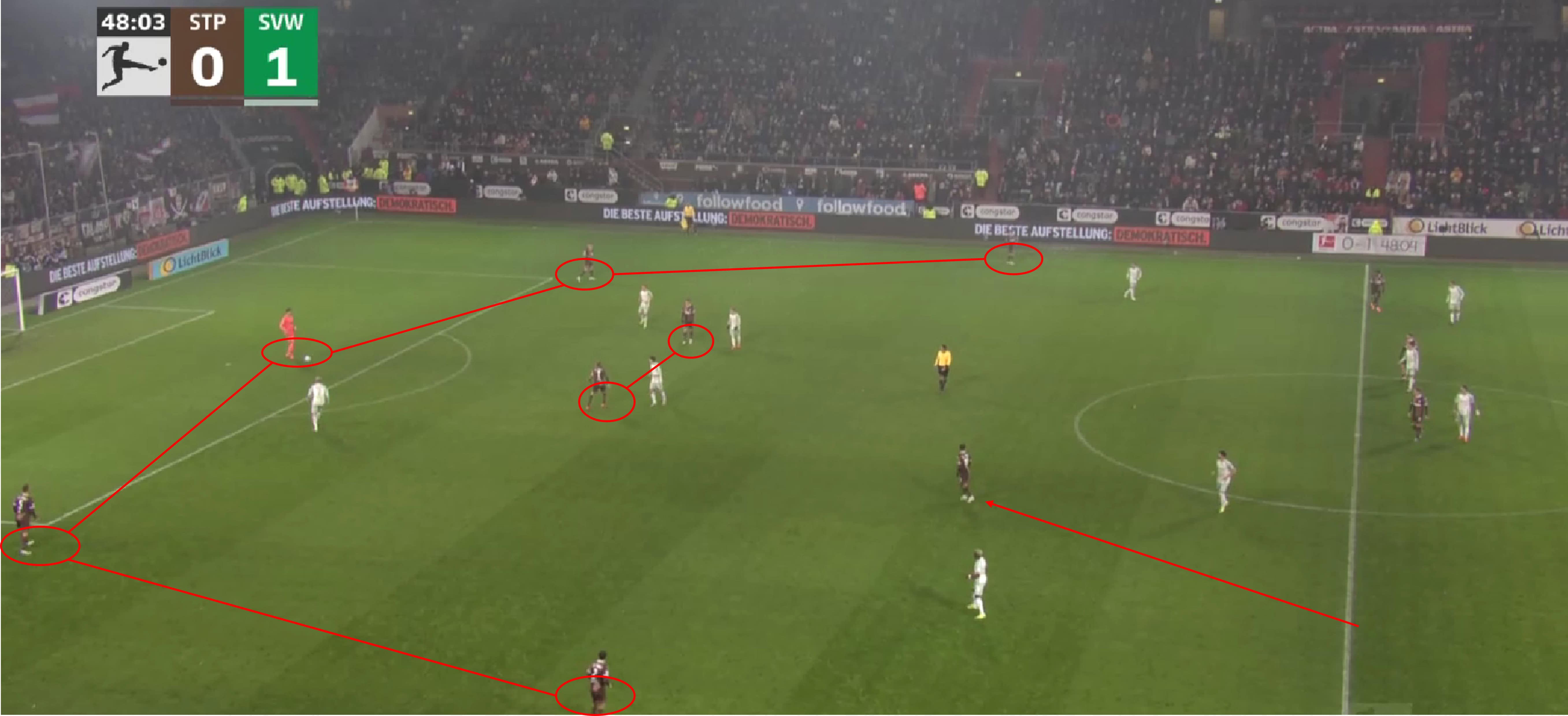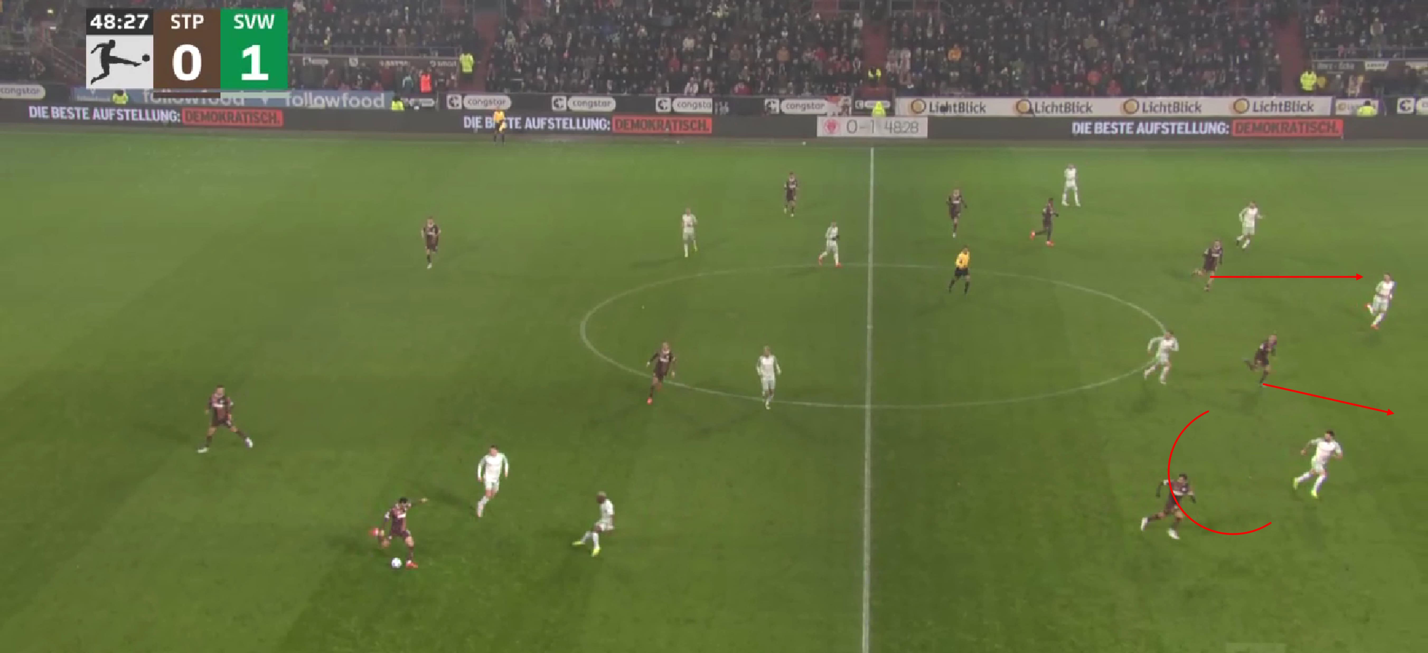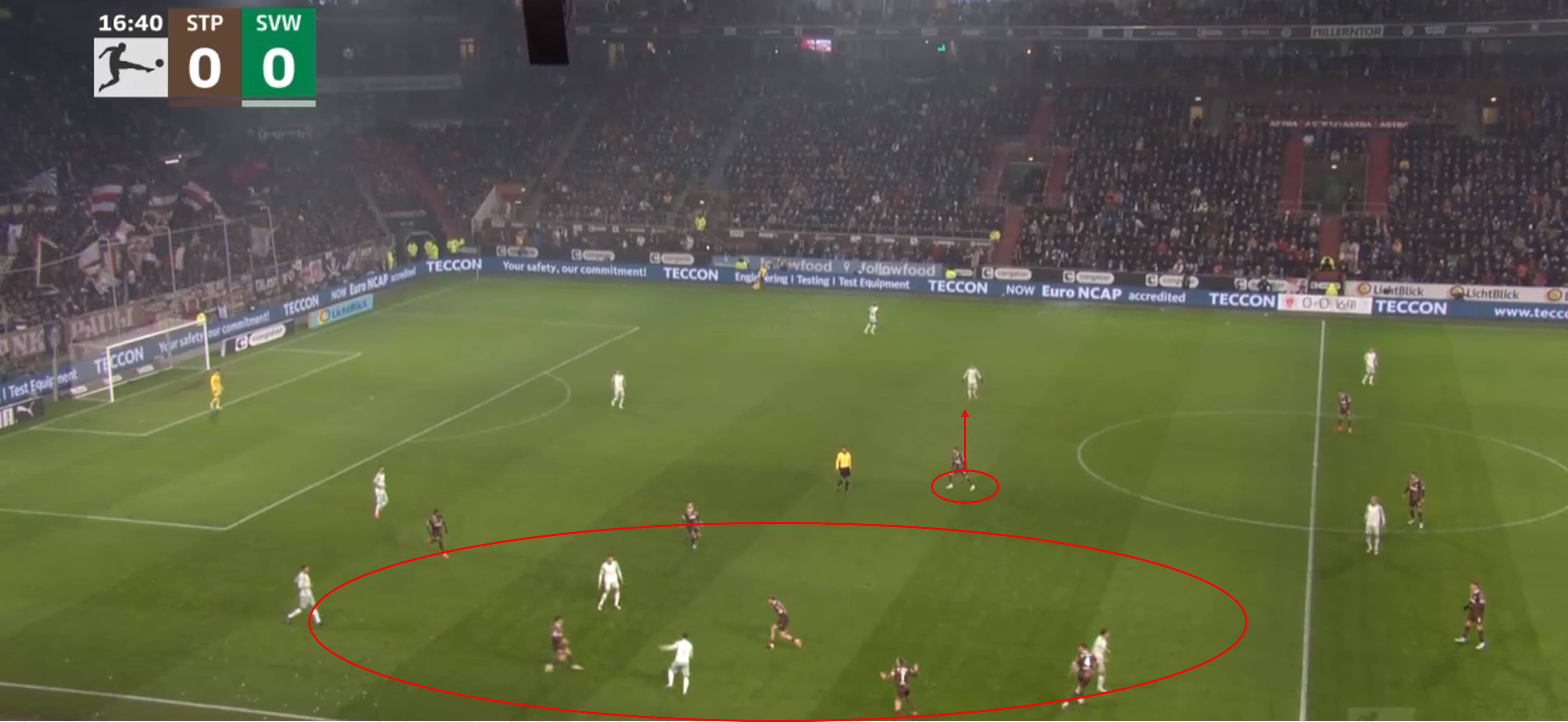 While this leaves one player open at the halfway line, St. Pauli know that a switch does not threaten them and can, therefore, always react in time if this player receives the ball.