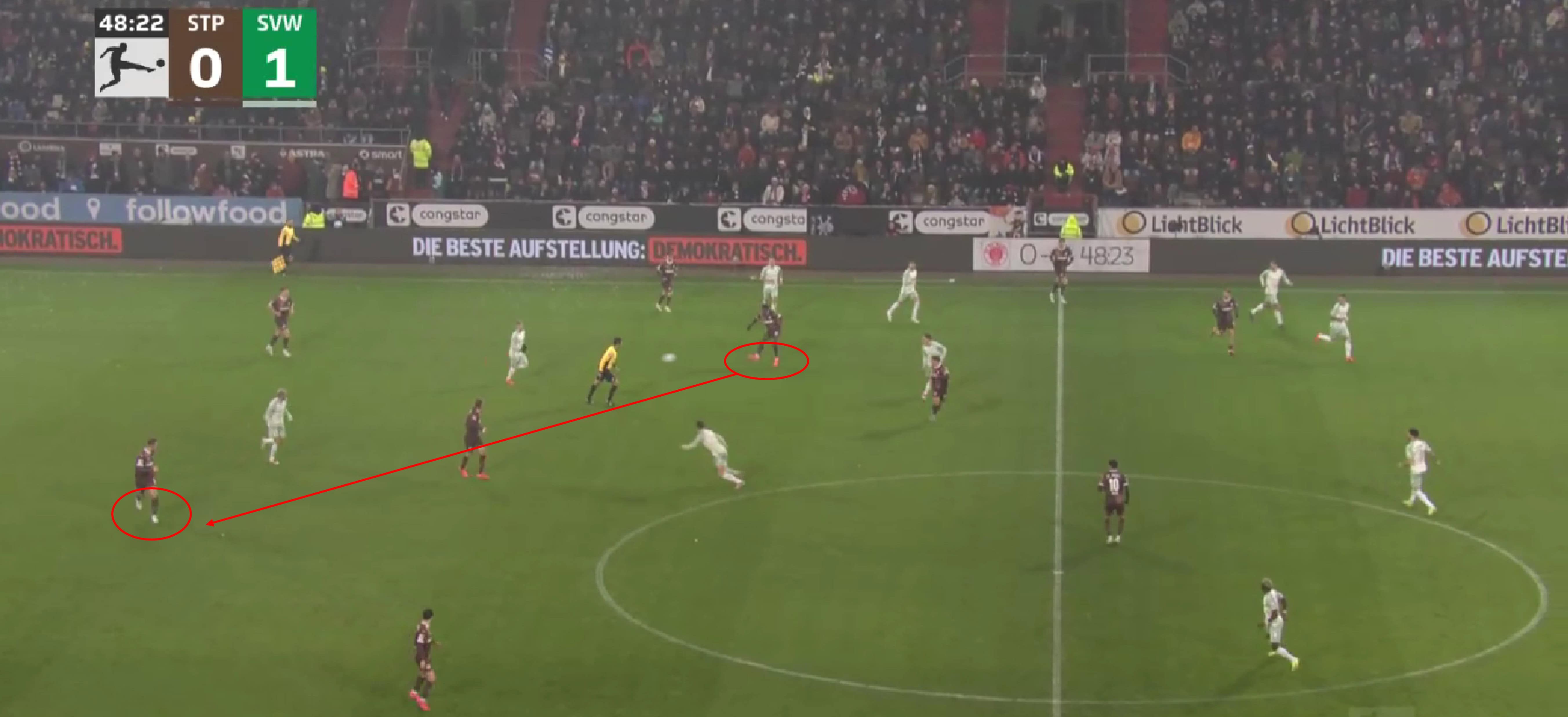 This leads to a backward pass from the Werder player, which is exactly what the St. Pauli players wanted here.