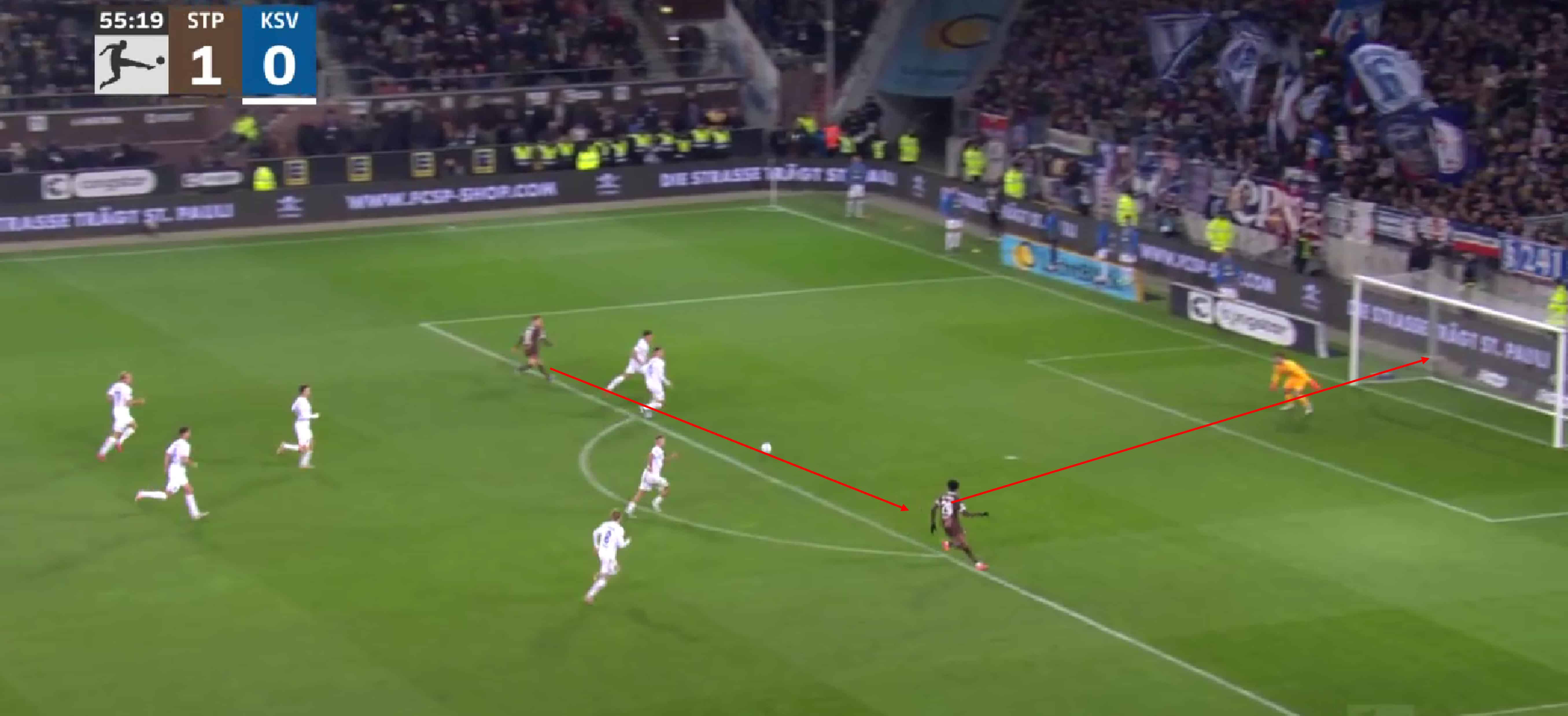 Now, Afolayan simply needs to pass to Eggestein, who squares the ball, resulting in an easy finish for St. Pauli.