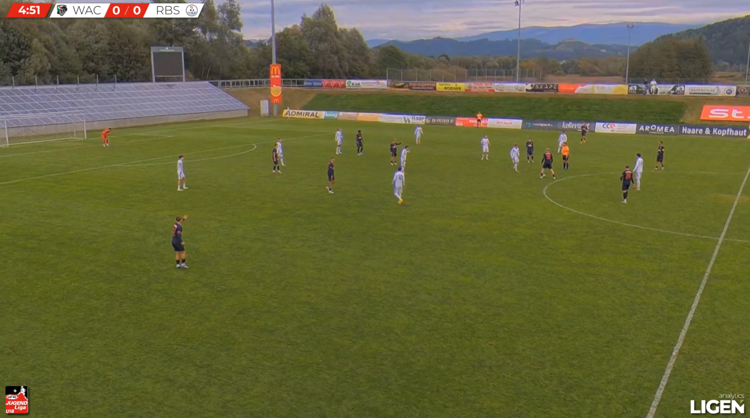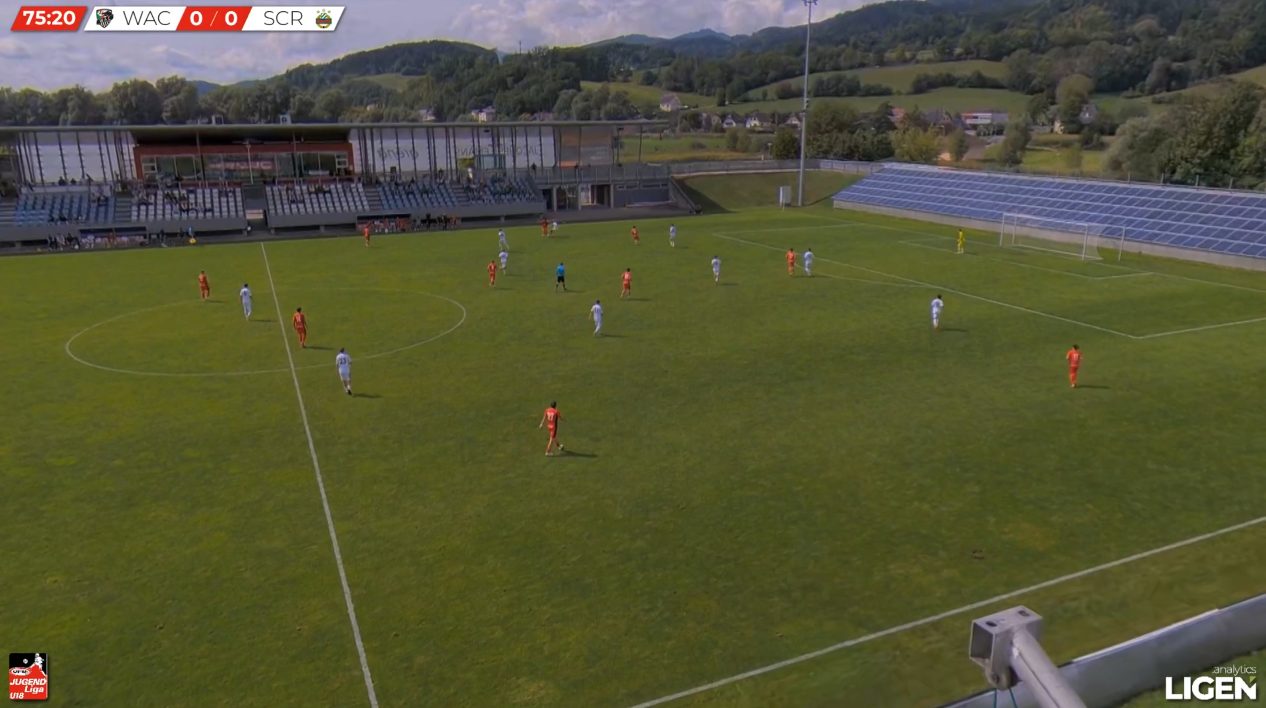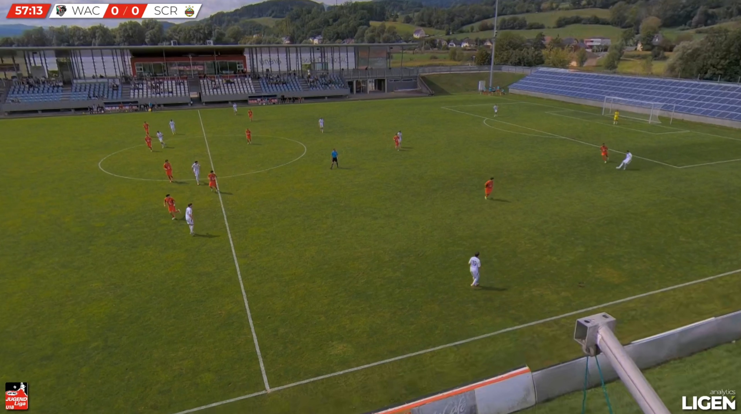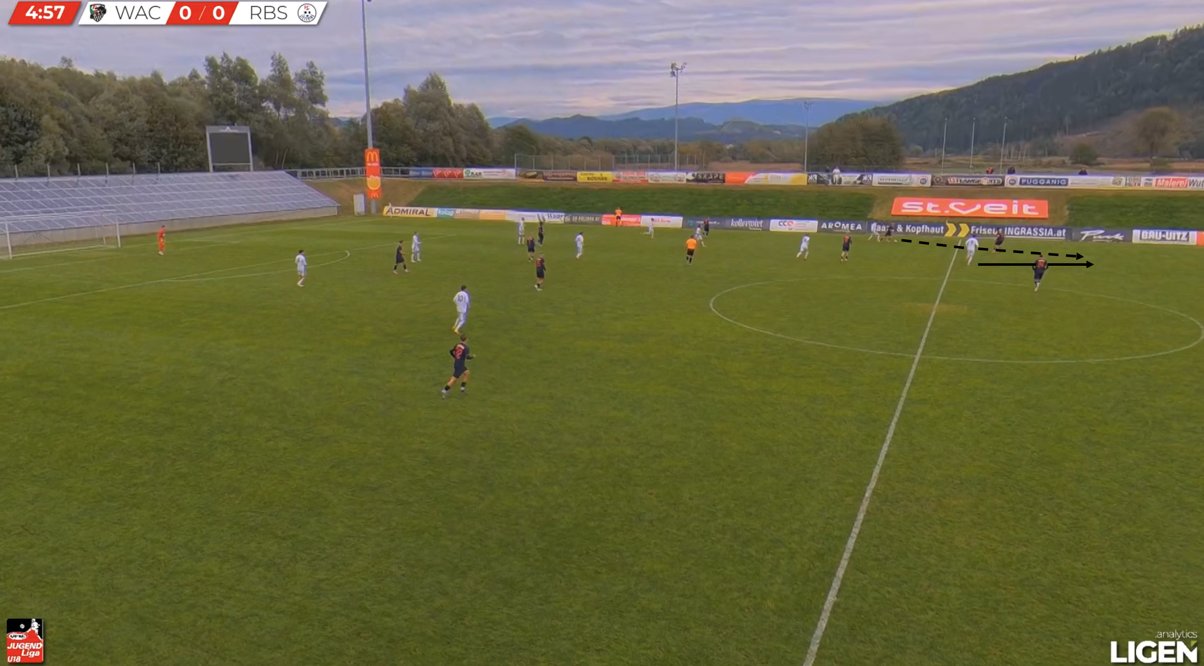 This example exhibits WAC U18s in a mid-block against opponents Red Bull Salzburg U18s, but this time in a 4-2-3-1 structure.
