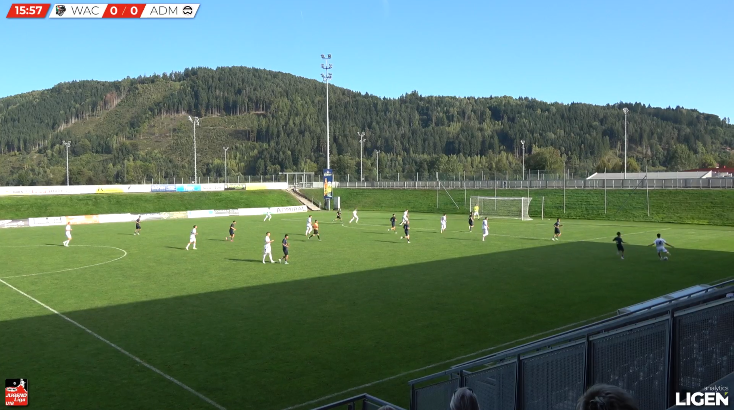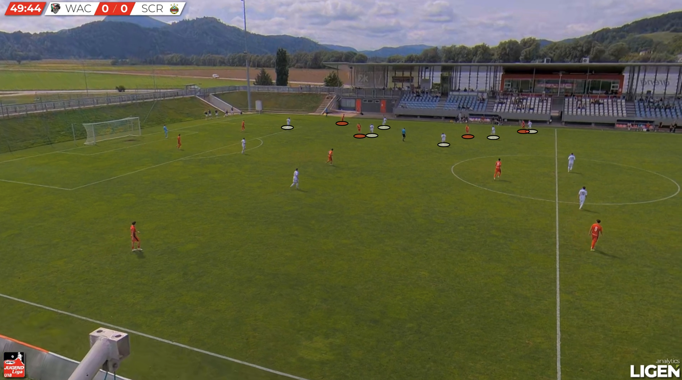 Meanwhile, the two centre-forwards of WAC U18s are positioned much higher, on the last line, in between opponents.