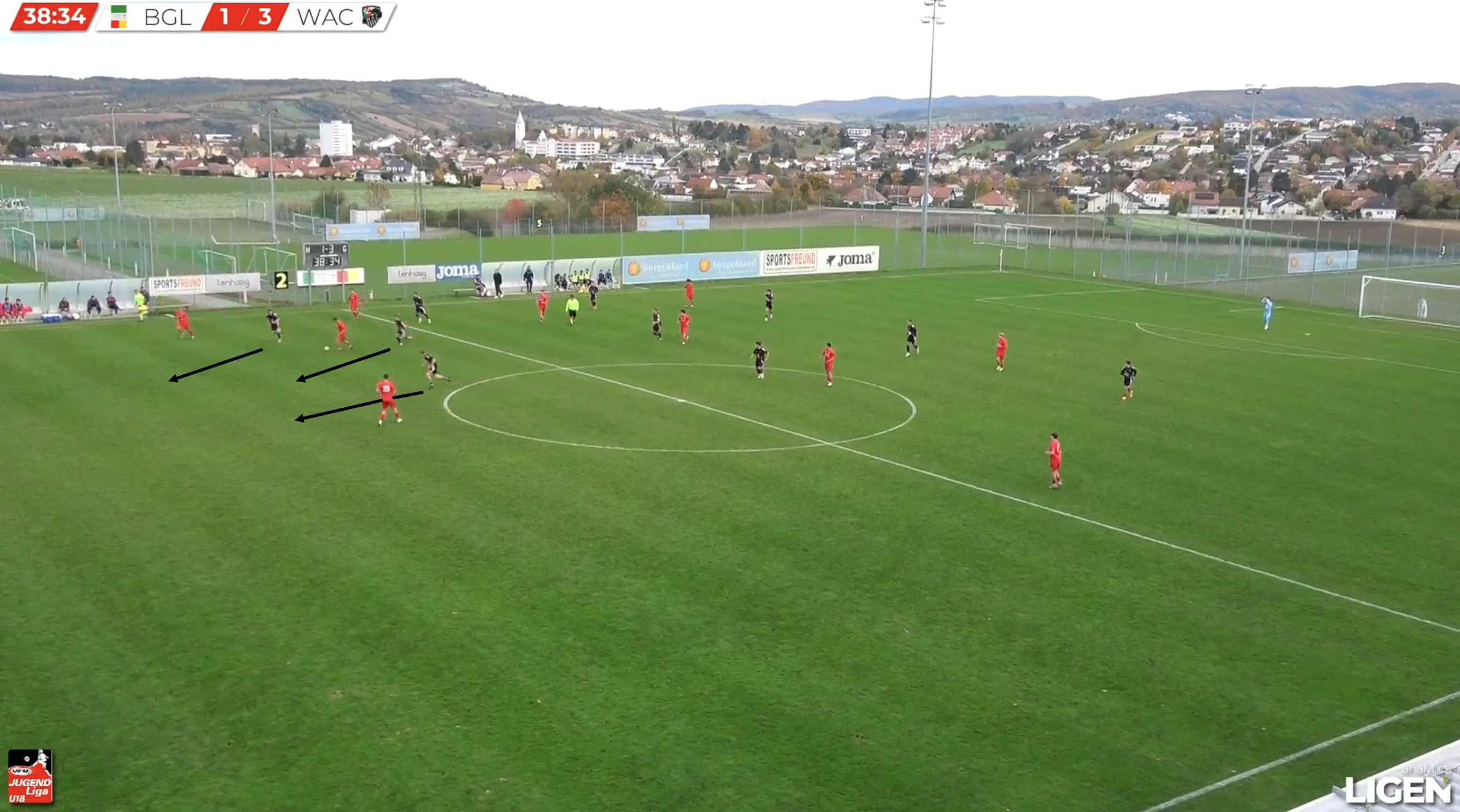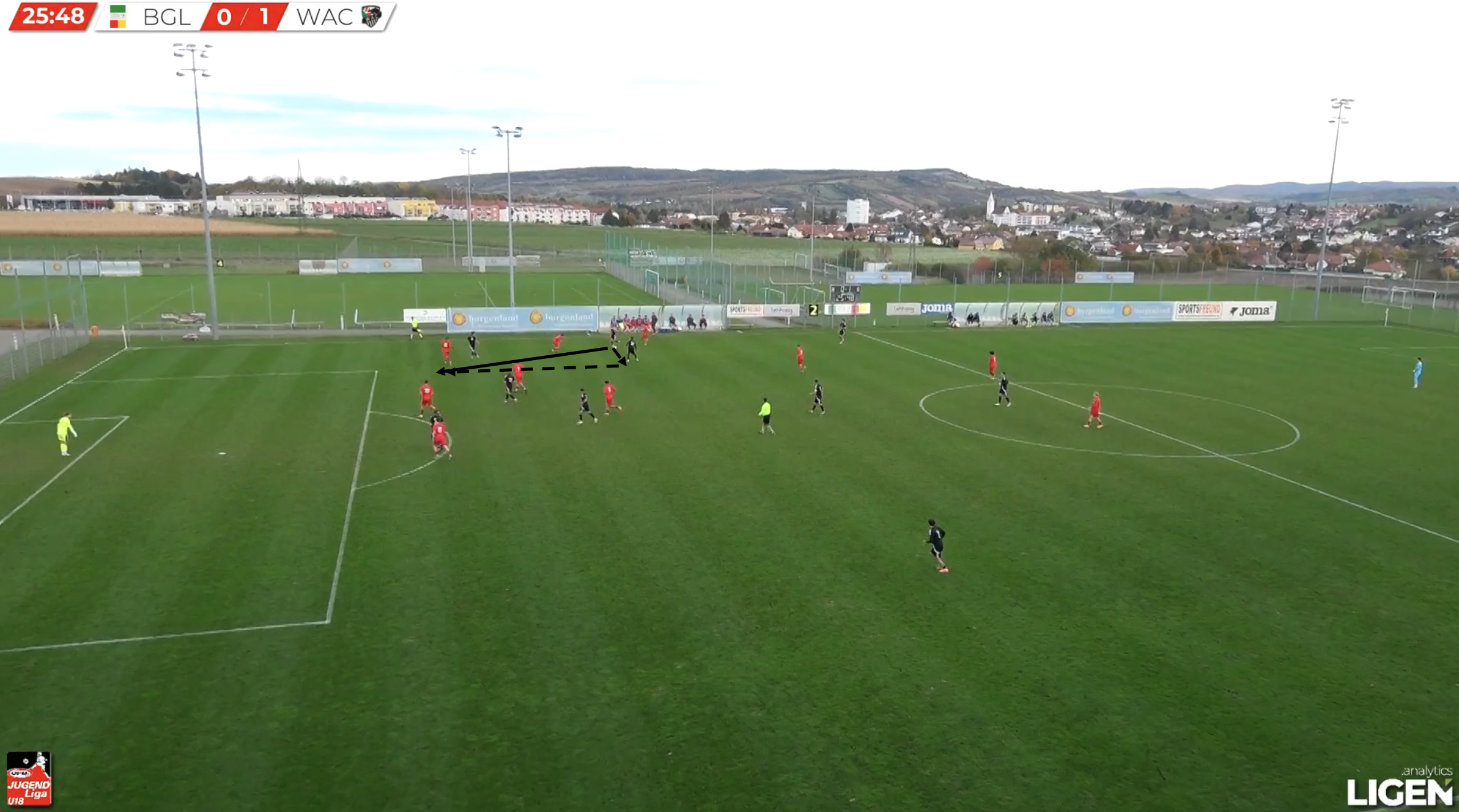 With all passes blocked and the ball carrier under great pressure, a loose pass is played back towards their own goal and is seized by the WAC U18s centre-forward, from which he attacks the open space behind the defence and scores.