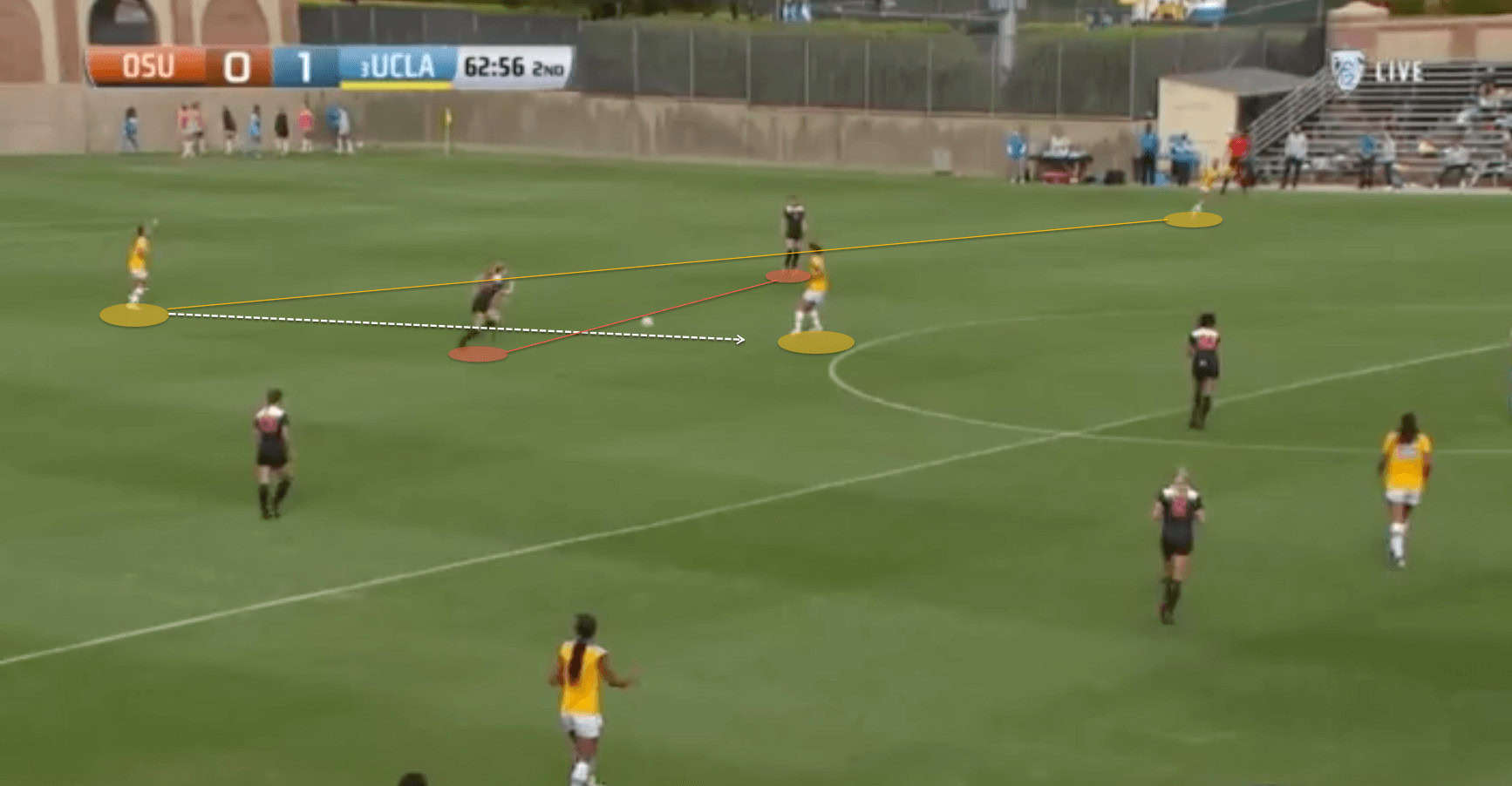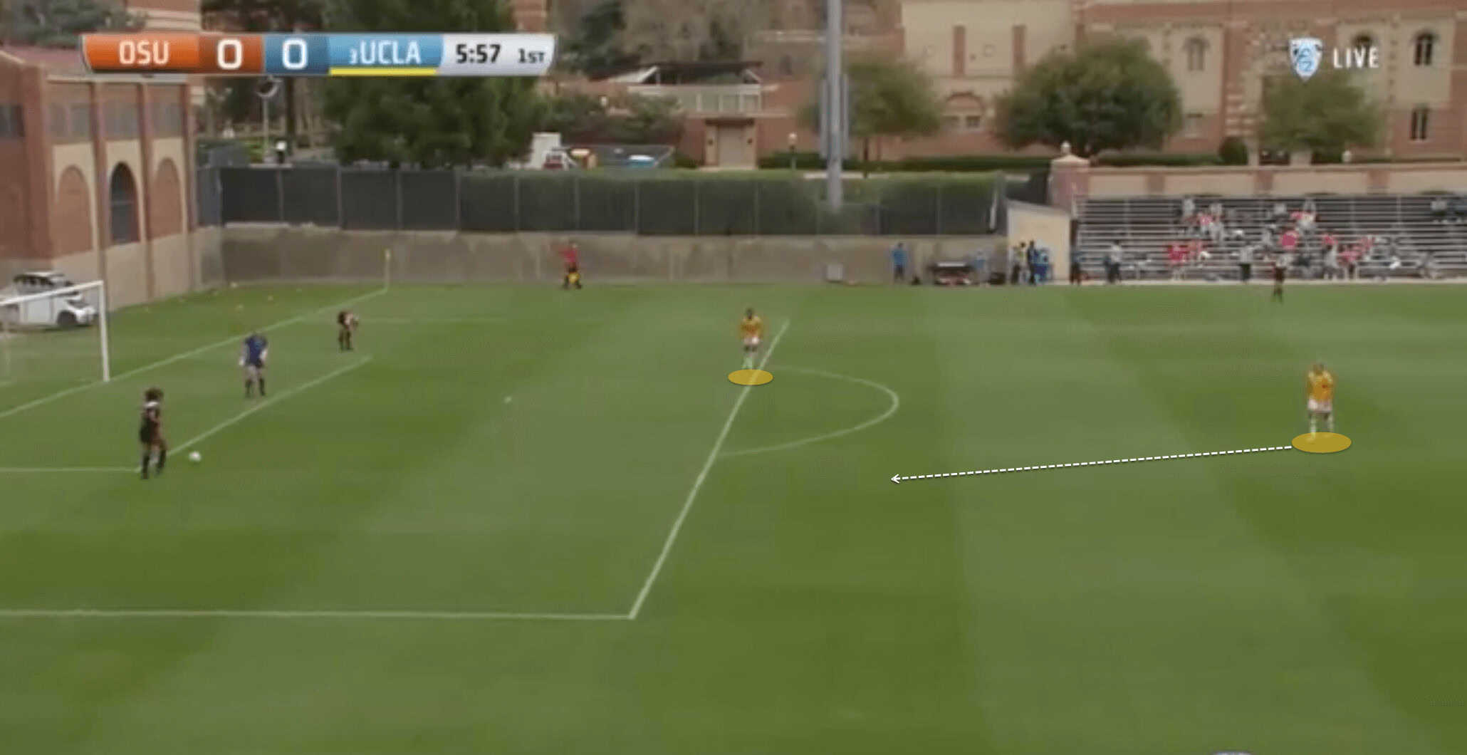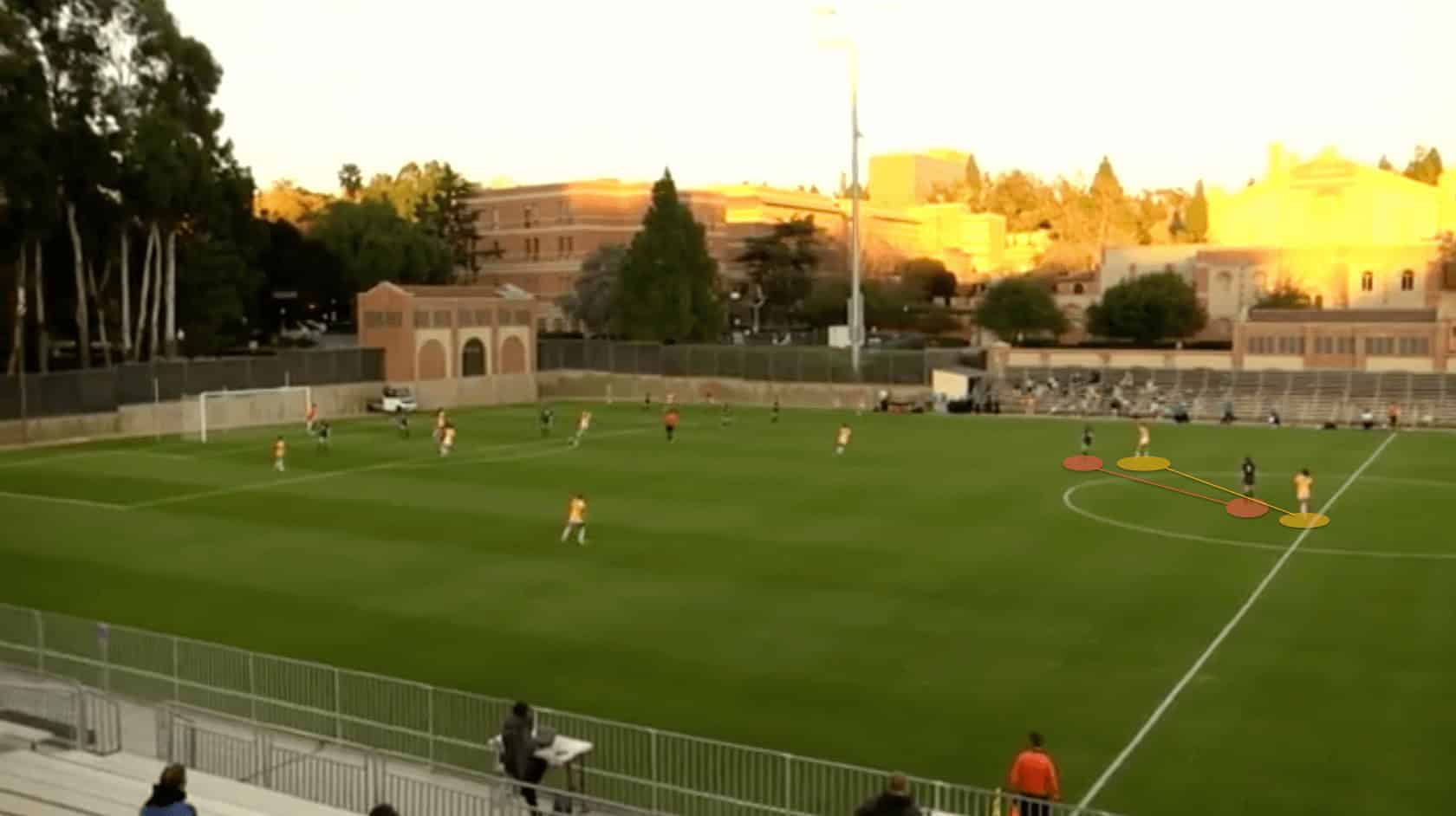 So whilst UCLA are patient in their build-up phase, as soon as they see an option to break the press and play forward, they do it swiftly. They can quickly turn circulating the ball around their own 18-yard-box into secure possession on a fast attack much farther up the pitch.