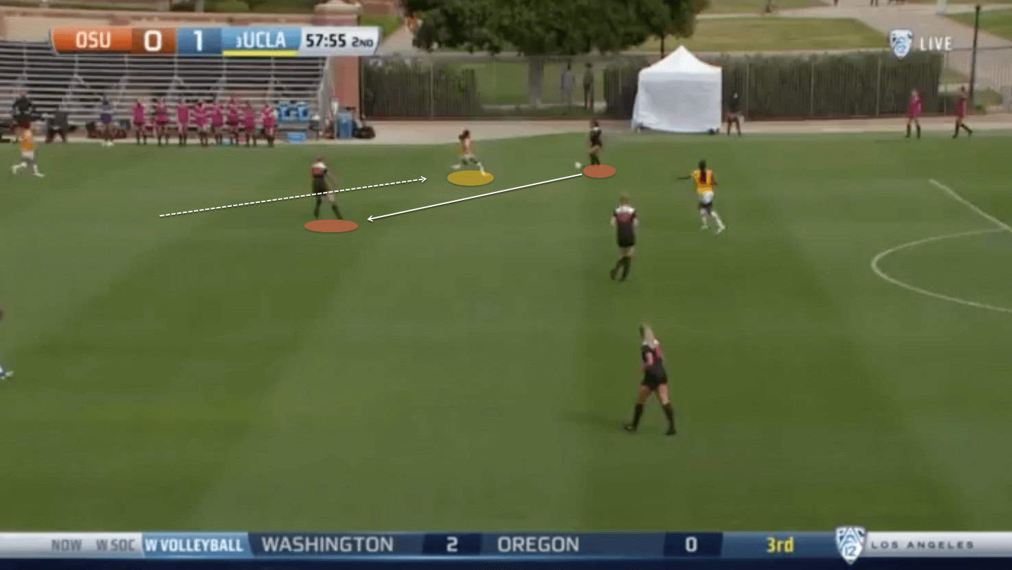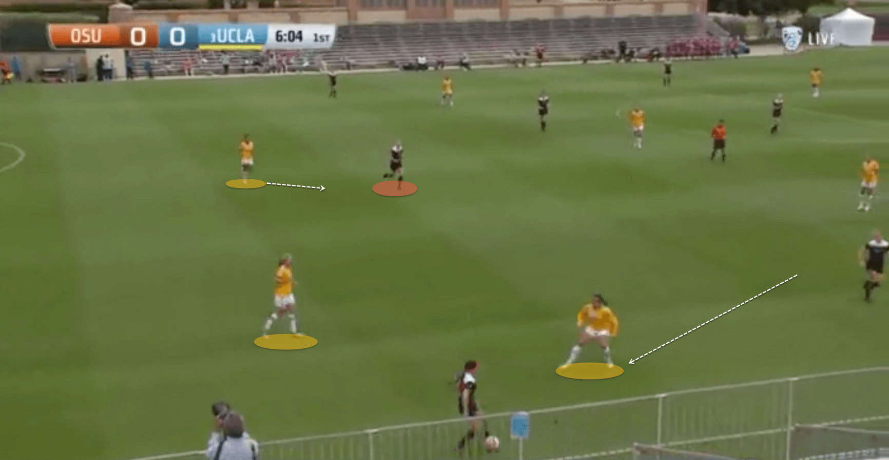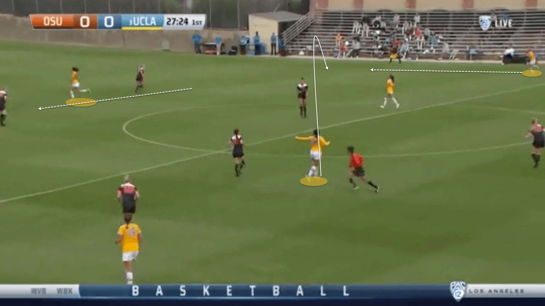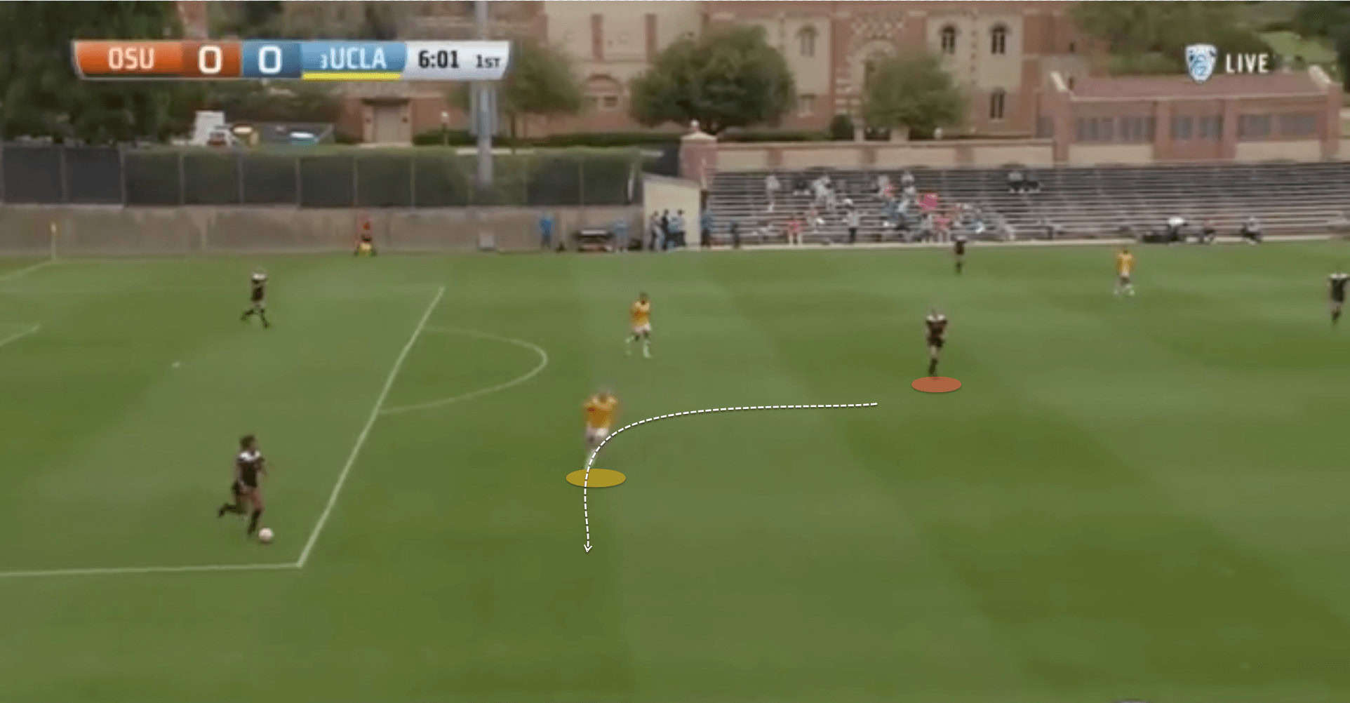So whilst UCLA are patient in their build-up phase, as soon as they see an option to break the press and play forward, they do it swiftly. They can quickly turn circulating the ball around their own 18-yard-box into secure possession on a fast attack much farther up the pitch.