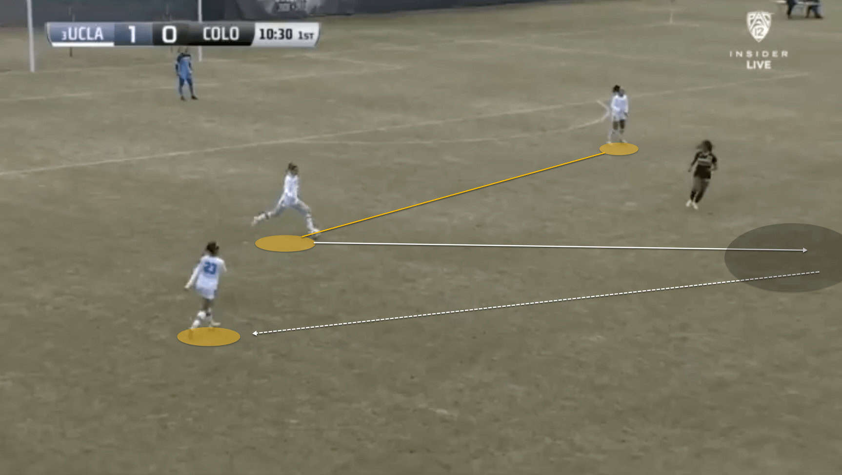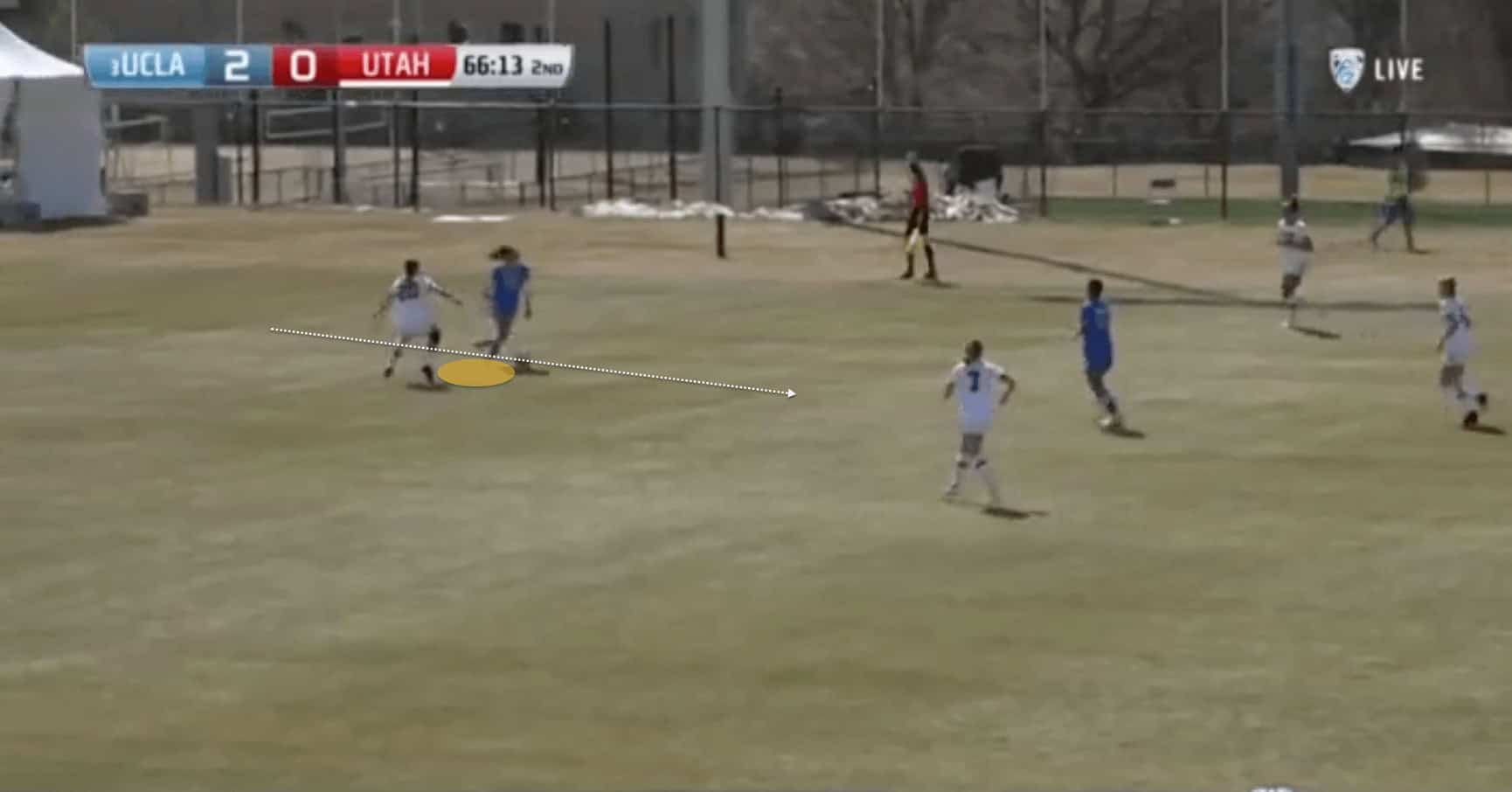 UCLA’s wingers will move inside. Starting from their wide position they will look to cut inside and hit the space between the opposition full-back and centre-back, whilst the ball is on the opposite flank. Both Novak and Turner have the pace to hurt teams that leave any space behind the back line without a keeper with a high position, and through-passes like in the image below represent a constant threat.