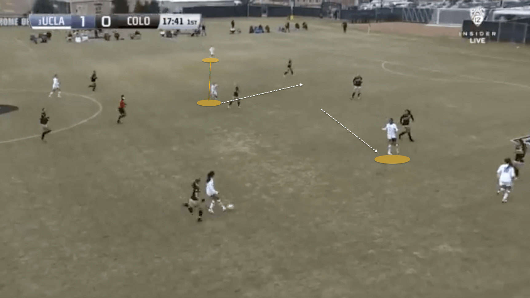 In this example the opposition centre-back drifts across whilst UCLA’s central-midfielder pushing forward occupies Colorado’s right-sided centre-back and right-back. In doing this they keep their defence narrow, whilst UCLA have a potential overload option on the left flank, which we can also see in the image above.